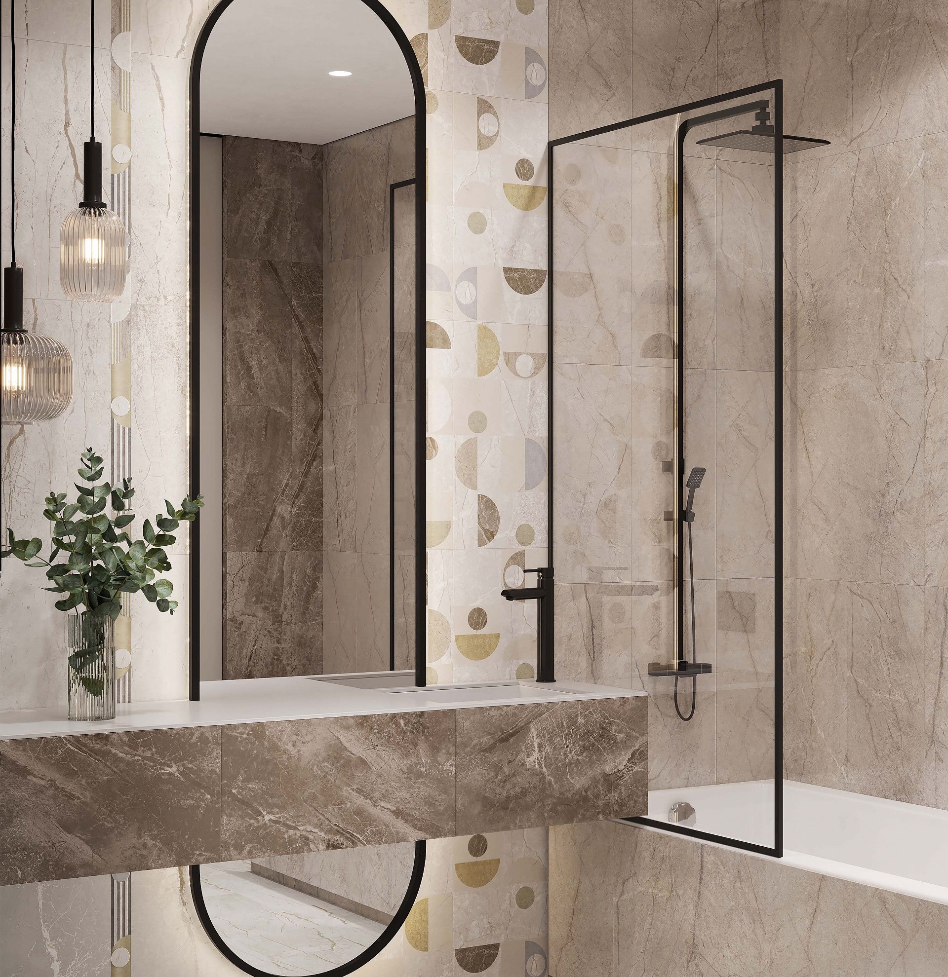 Интерьерная коллекция керамической плитки Андорра демонстрирует гармоничное сочетание нескольких стилей и цветов, создавая современный, элегантный и утонченный дизайн комнат. Плитка с прожилками мрамора светло-бежевого оттенка используется в качестве основного фона на стенах. Она придаёт пространству ощущение роскоши и изысканности. Акцентные элементы: в некоторых участках может использоваться плитка с графическим принтом, представляющим собой разнообразные геометрические формы (полукруги, круги, полоски) в мягких пастельных тонах (серый, бежевый, золотистый). Это добавляет объёма и интереса в пространство, делая его более динамичным. Плитка темно-коричневого цвета с насыщенной мраморной текстурой может использоваться для создания контраста и выделения определённых зон, таких как ниша под раковину или зона душевой. В целом, коллекция плитки в интерьере создаёт сбалансированное и стильное пространство, подходящее для современного дома.