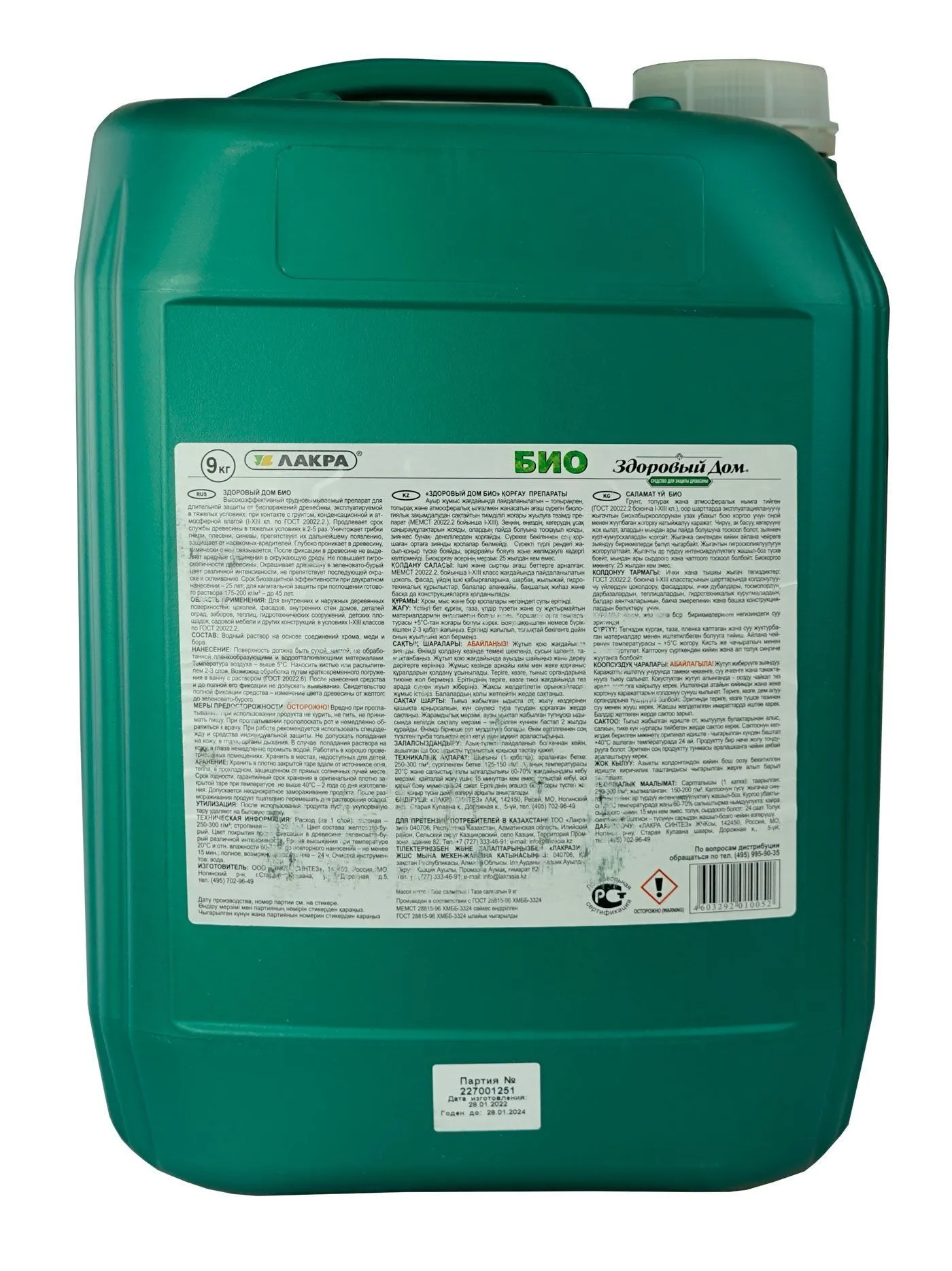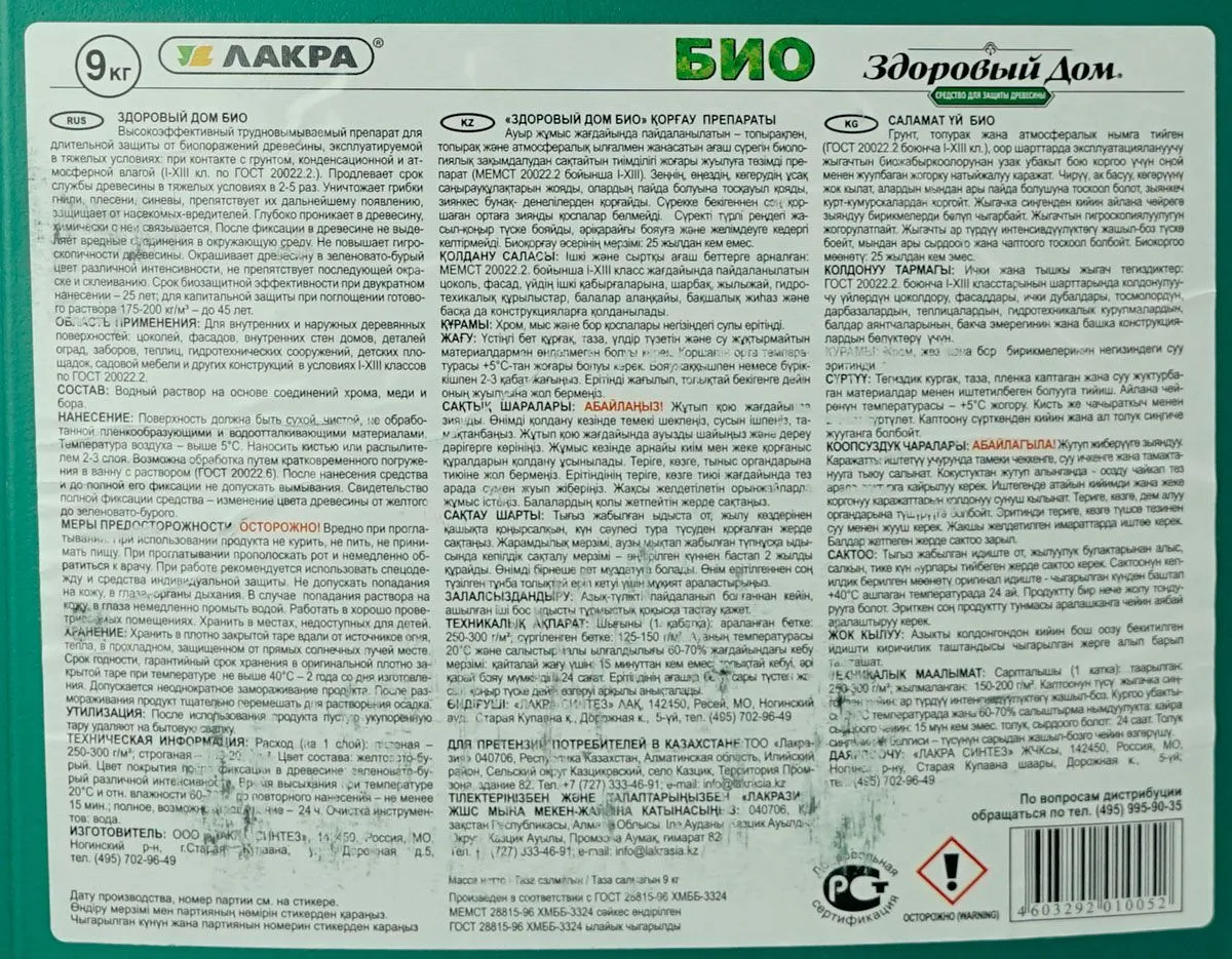 Нанесение: Поверхность должна быть сухой, чистой, не обработанной пленкообразующими и водоотталкивающими материалами. Температура окружающей среды - выше 5°С. Наносить кистью или распылителем 2-3 слоя. После нанесения средства и до полной его фиксации не допустить вымывания. Свидетельством полной фиксации является изменение цвета древесины от желтого до зеленовато-бурого. Возможна обработка путем кратковременного погружения в ванну со средством (ГОСТ 20022.6). Детали для пропитки по способу кратковременного погружения должны пройти полную механическую обработку. Пропитку проводят в емкостях из коррозионно-устойчивых материалов. Уровень раствора должен быть на 100 мм выше уровня деталей. Температура раствора в течение всего цикла пропитки не ниже 20°С. Емкости необходимо держать закрытыми во избежание испарения растворителя. ХРАНЕНИЕ: 24 месяца в оригинальной таре при температуре не выше 40°С. Допускается неоднократное замораживание продукта. После размораживания продукт тщательно перемешать для растворения осадка. ТЕХНИЧЕСКАЯ ИНФОРМАЦИЯ: Состав: Водный раствор на основе соединений хрома, меди и бора. Рекомендуемый расход (на 1 слой): пиленая: 250-300 г/м2 строганая: 150-200 г/м2. Время высыхания при 20°С и отн. влажности 60-70%: до повторного нанесения: не менее 15 мин. полное, возможно последующее окрашивание: 24 ч