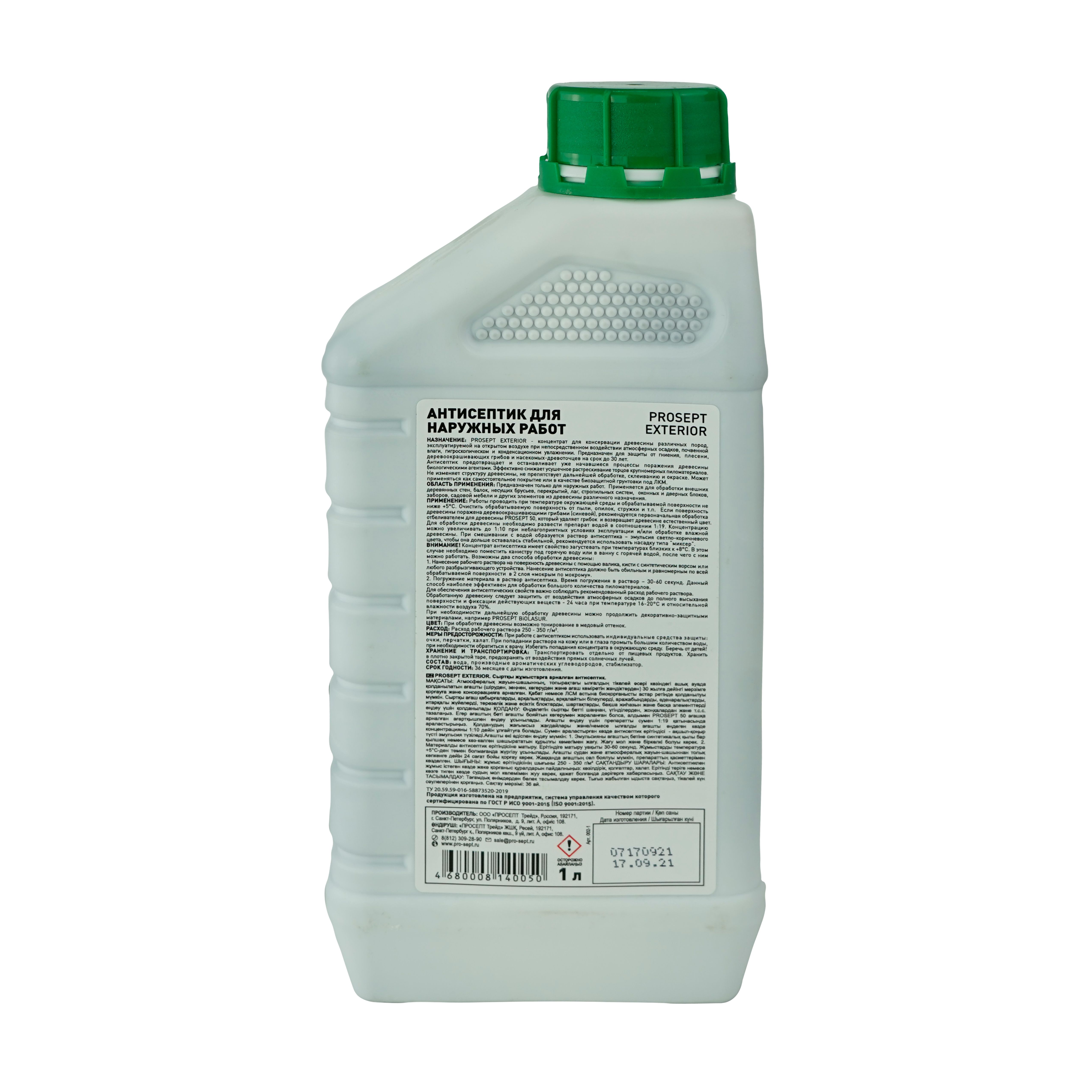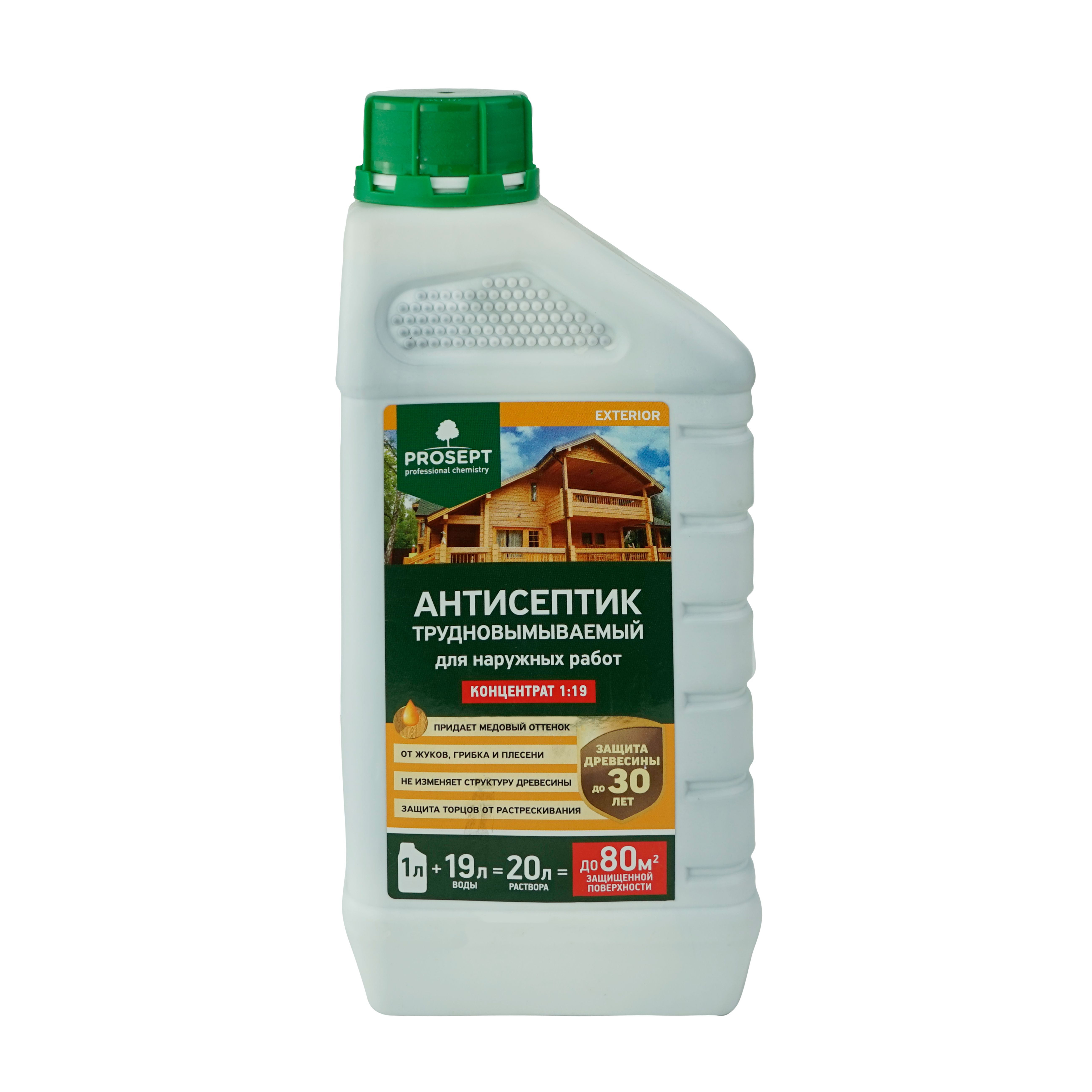 Антисептик PROSEPT EXTERIOR для наружных работ предназначен для защиты и консервации древесины различных пород (от гниения, плесени, синевы и насекомых-древоточцев), эксплуатируемой на открытом воздухе при непосредственном воздействии атмосферных осадков, почвенной влаги, гигроскопическом и конденсационном увлажнении.
