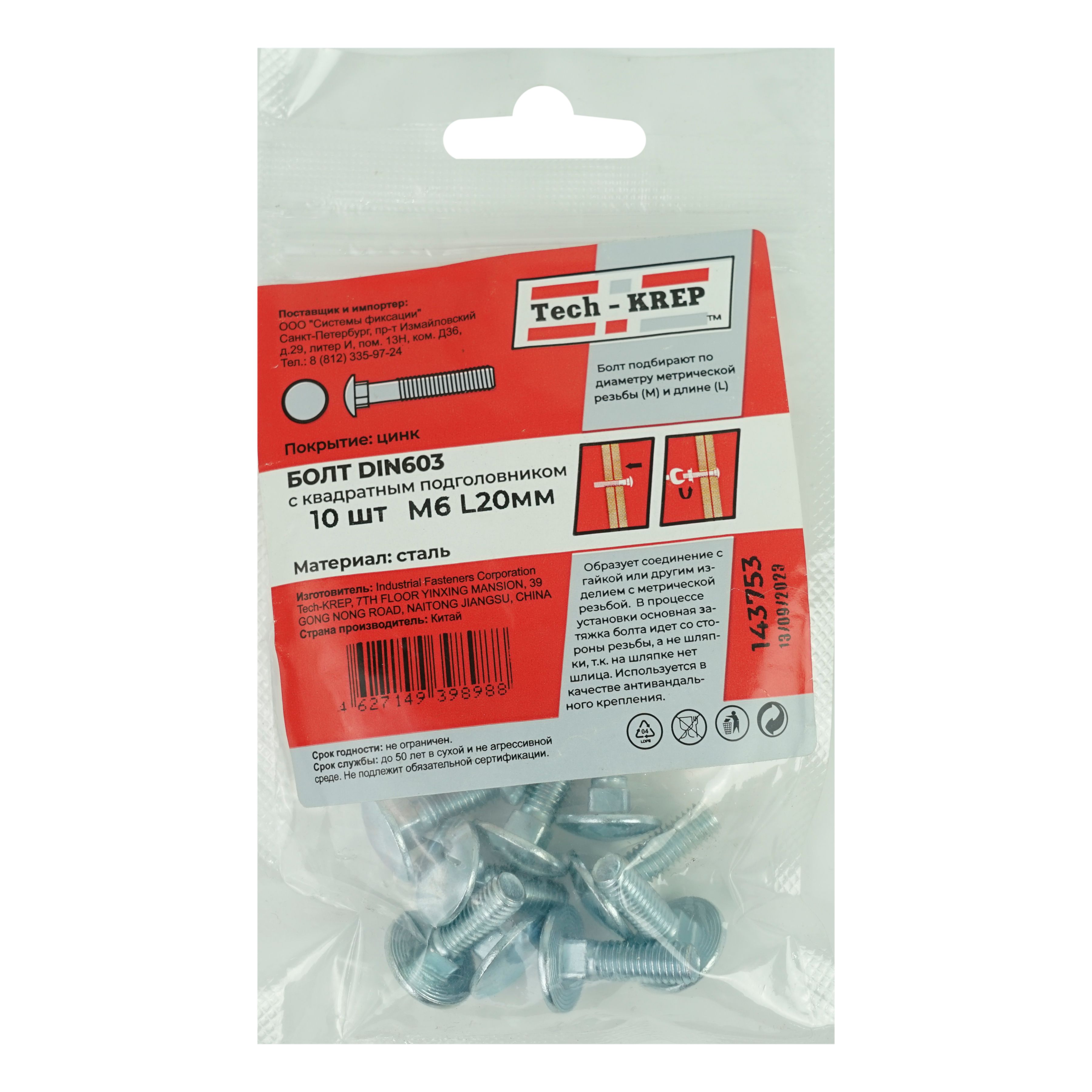 За счет подголовника, утопленного в квадратном посадочном месте, болт мебельный не прокручивается в отверстии при затягивании. Широкая низкопрофильная шляпка хорошо прижимает скрепляемые детали, не продавливая поверхность в месте крепления.