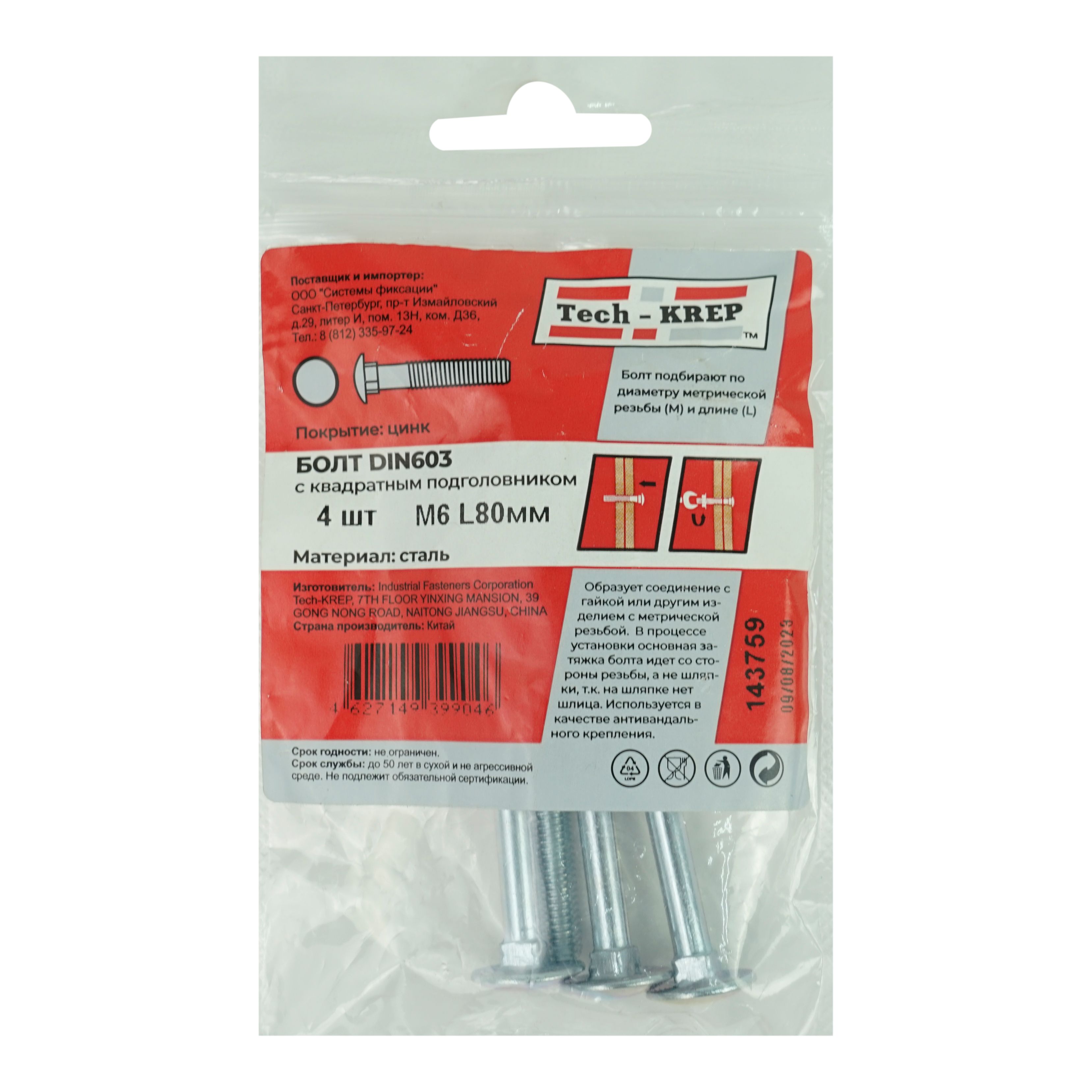 За счет подголовника, утопленного в квадратном посадочном месте, болт мебельный не прокручивается в отверстии при затягивании. Широкая низкопрофильная шляпка хорошо прижимает скрепляемые детали, не продавливая поверхность в месте крепления.
