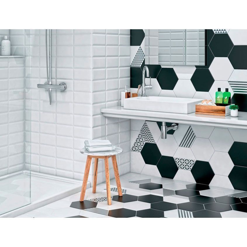 • У плитки матовая поверхность однотонная. Цвет — белый — сочетается с широкой палитрой оттенков и не связывает руки при выборе других элементов оформления. Классическая форма (шестигранник) позволяет экспериментировать со схемами раскладки, комбинировать контрастные цвета;