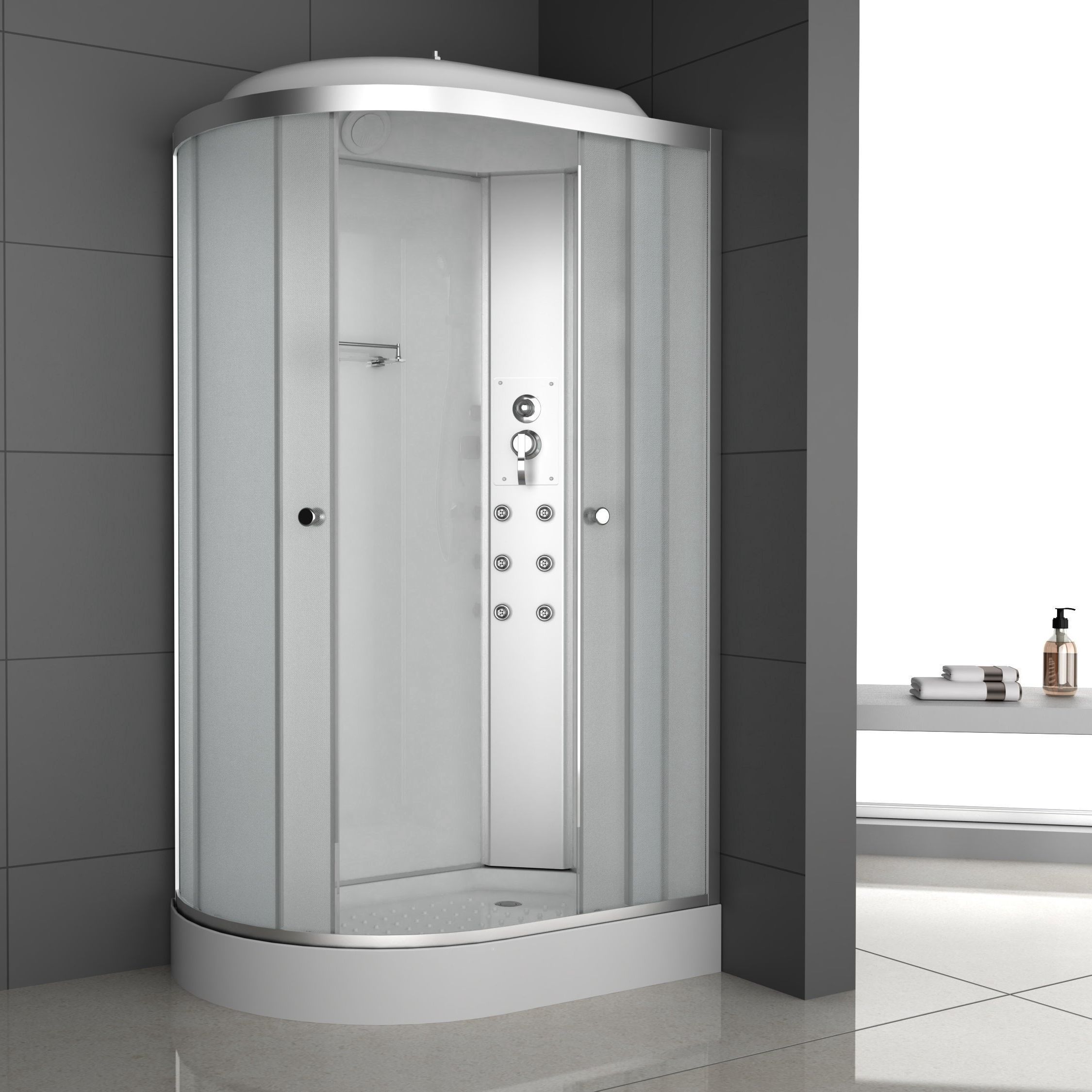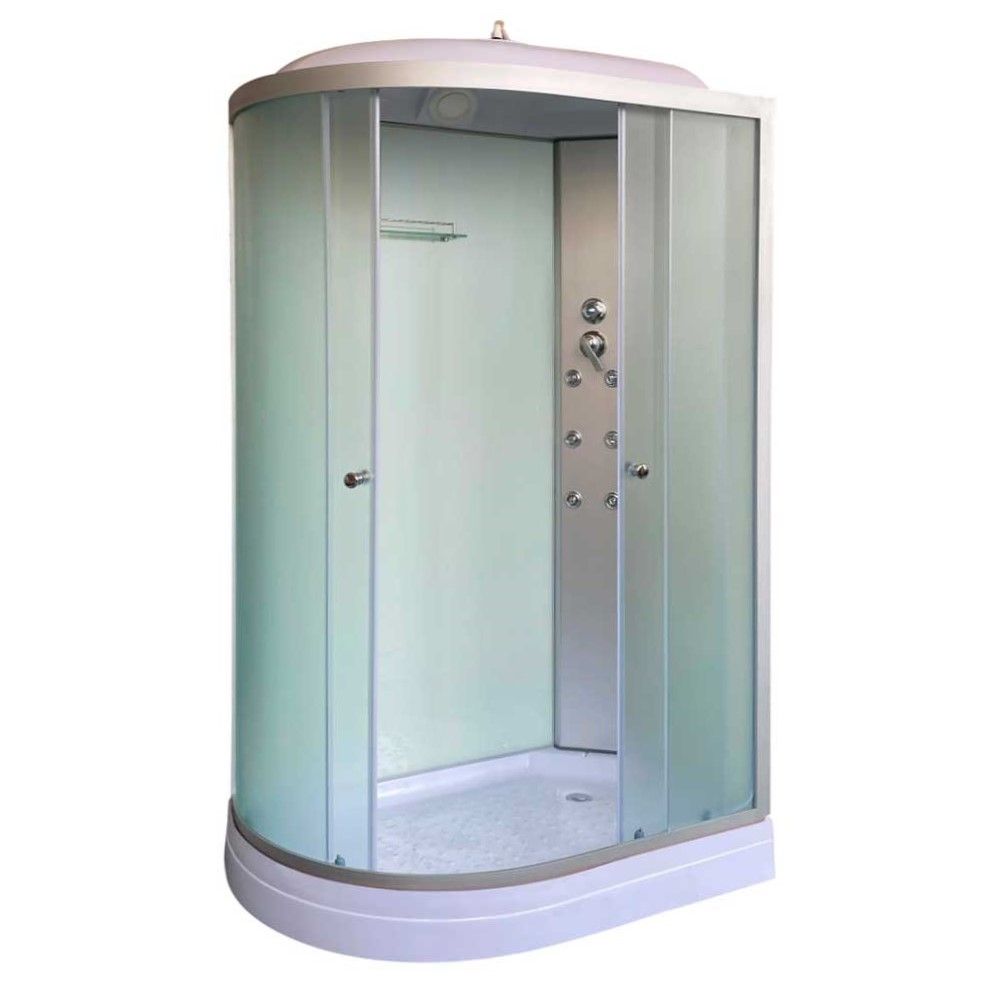 - В качестве функционального оснащения в модели предусмотрены тропический и ручной душ, гидромассаж 6 форсунок, смеситель с тремя режимами, стеклянная полочка и вытяжка.
