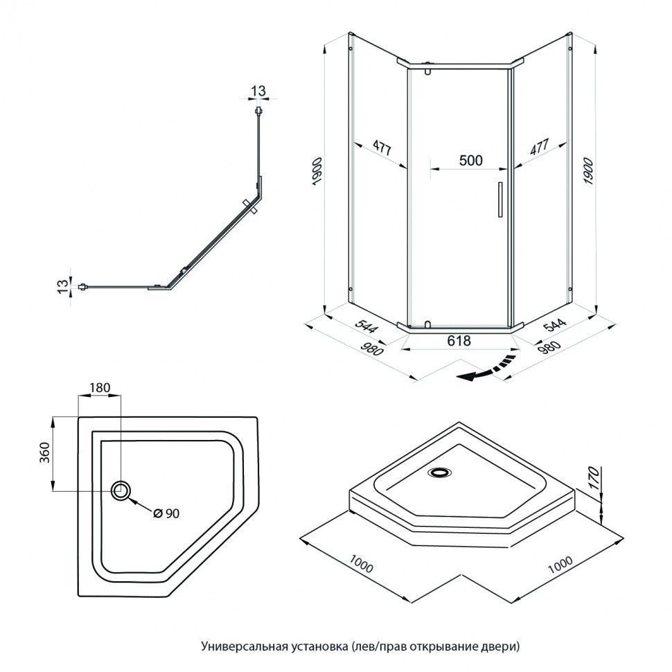 Душевой уголок Дека-Хром (Тритон)1000х1000х2070 мм, пятитугольный.