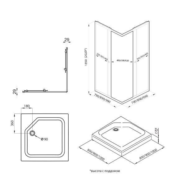 Душевой уголок Вента-Хром (Тритон) 800х800х2020 мм, квадратный.