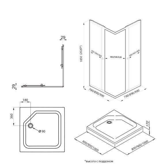 Душевой уголок Вента-Хром (Тритон) 900х900х2020 мм, кадратный.