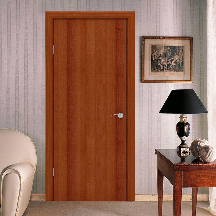 Дверь легко укладывается в самый скромный семейный бюджет. Такой сдержанный дизайн в сравнении с остекленными аналогами обладает лучшей звукоизоляцией и возможностью не пропускать свет, что особенно подходит для комнат, выходящих в коридор. Ее каркасно-щитовая конструкция считается наиболее распространенным видом, представляя собой раму из массива хвойных пород, которая закрывается двумя листами МДФ. Выполненное на бумажной основе покрытие при бережном уходе прослужит ни один год. Однако они могут потерять внешний вид от влаги и механического воздействия. Гладкое покрытие по сравнению со структурным более долговечное и за ним легче ухаживать.
