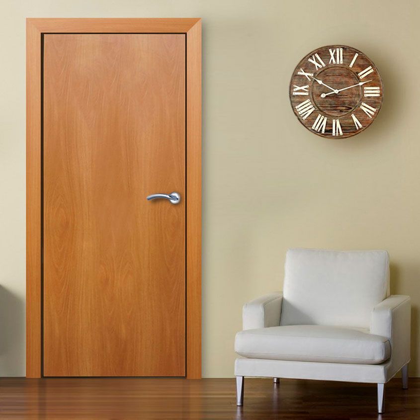Дверь легко укладывается в самый скромный семейный бюджет. Такой сдержанный дизайн в сравнении с остекленными аналогами обладает лучшей звукоизоляцией и возможностью не пропускать свет, что особенно подходит для комнат, выходящих в коридор. Ее каркасно-щитовая конструкция считается наиболее распространенным видом, представляя собой раму из массива хвойных пород, которая закрывается двумя листами МДФ. Выполненное на бумажной основе покрытие при бережном уходе прослужит ни один год. Однако они могут потерять внешний вид от влаги и механического воздействия. Гладкое покрытие по сравнению со структурным более долговечное и за ним легче ухаживать.