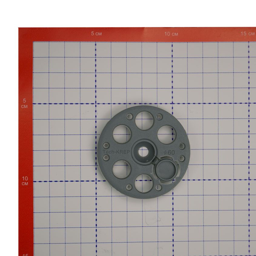 Изготовлен из полимерных материалов, имеет вид широкого кольца с соединяющими перемычками и углублением посередине, куда вставляется шуруп.