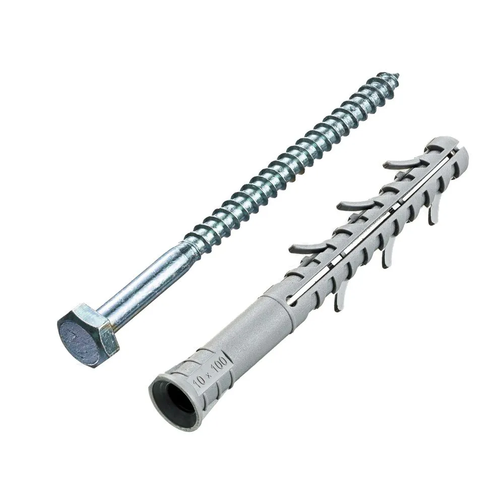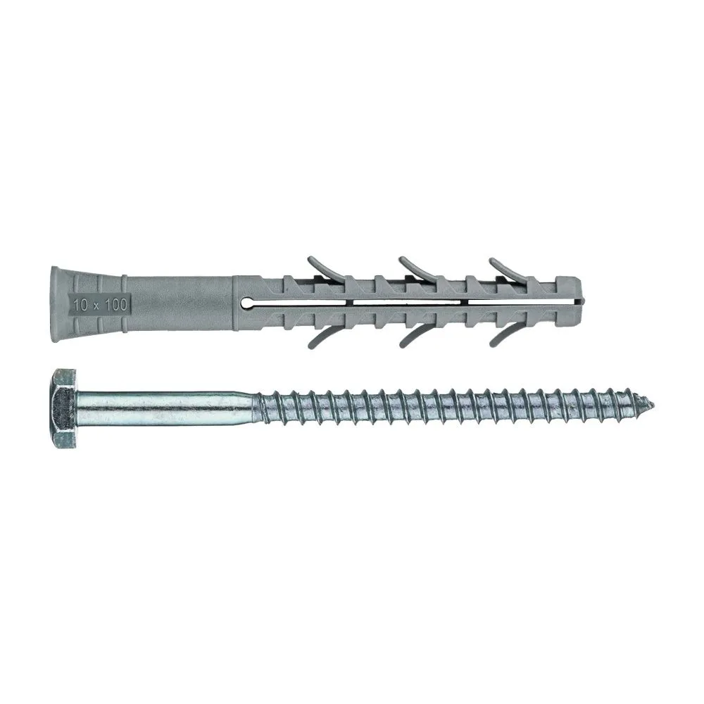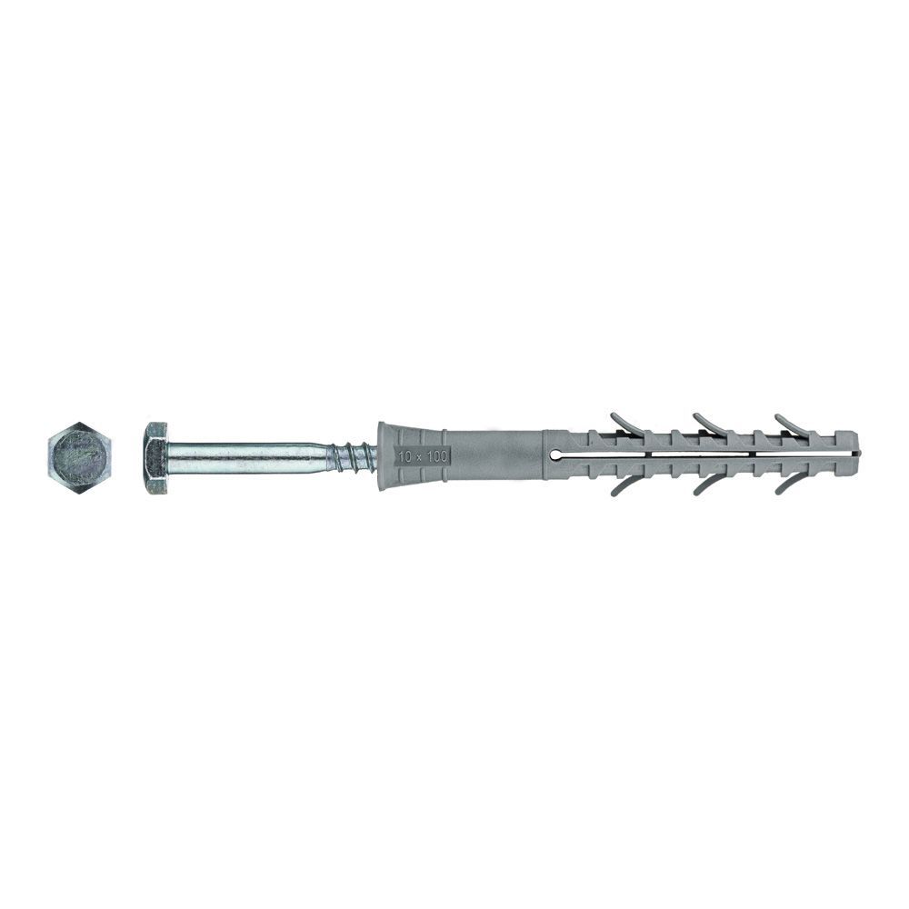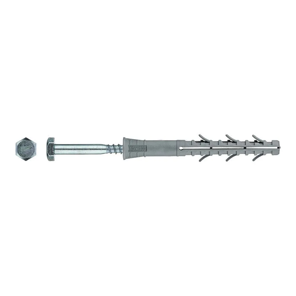 Дюбель фасадный с шестигранной головкой 10х100мм состоит из следующих элементов: гильза с конусообразным бортиком и двухсегментной распорной зоной; распорный элемент – усиленный шуруп с шестигранной головкой под ключ.