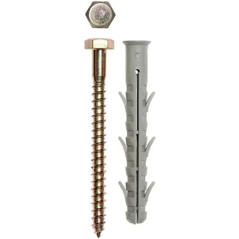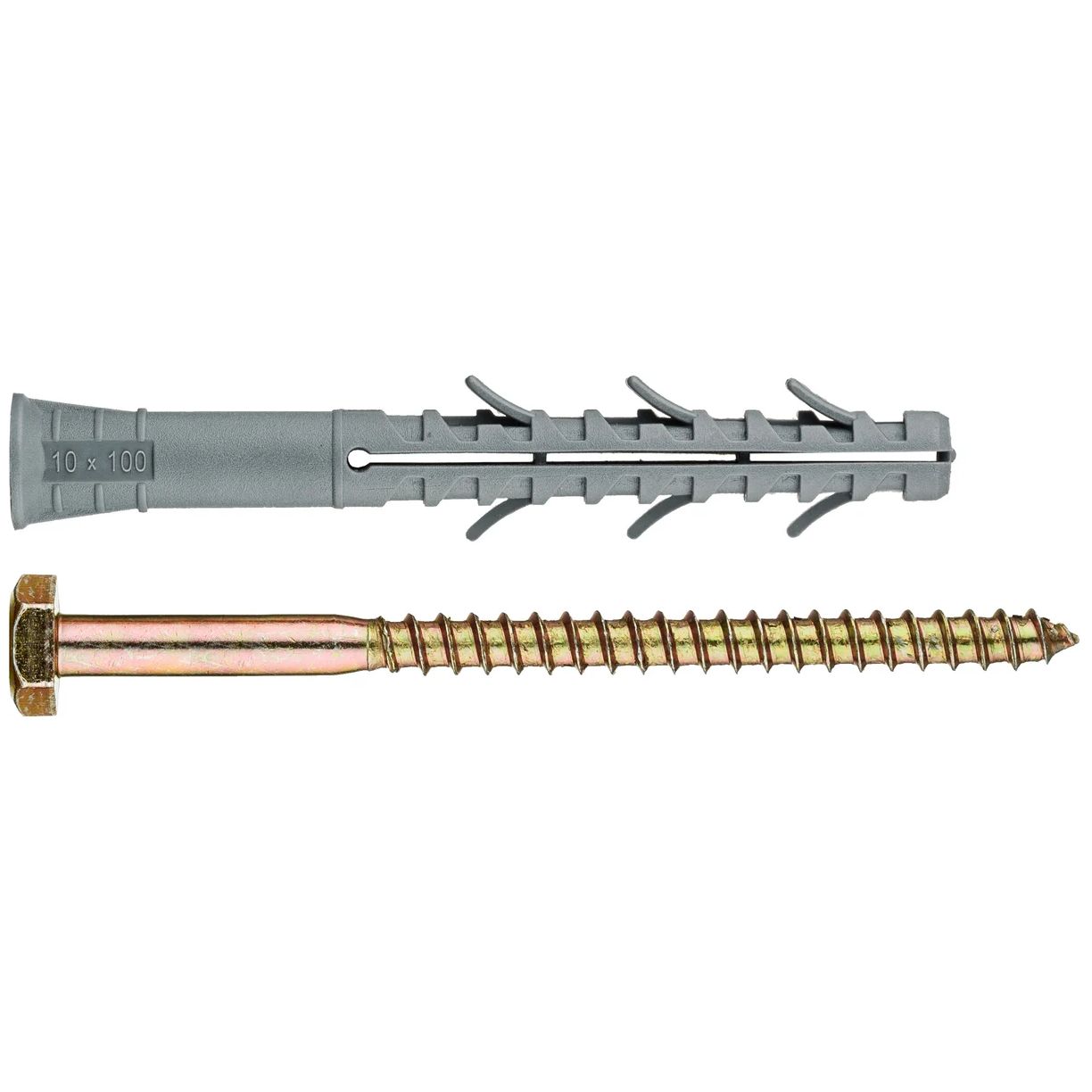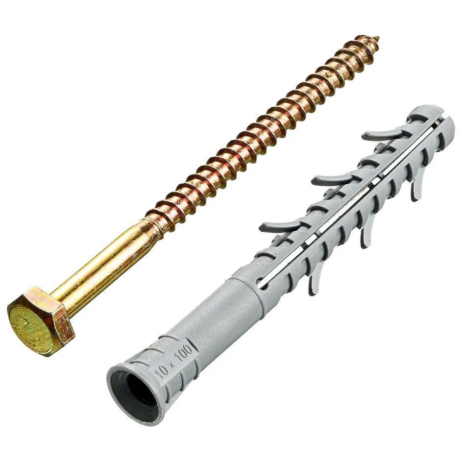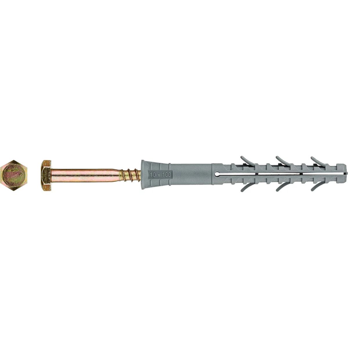 Дюбель фасадный с шестигранной головкой 10х100мм состоит из следующих элементов: гильза с конусообразным бортиком и двухсегментной распорной зоной; распорный элемент – усиленный шуруп с шестигранной головкой под ключ.