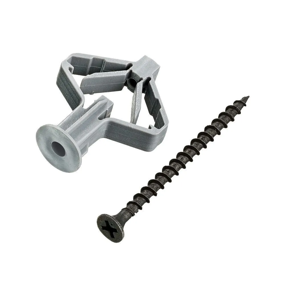 Полипропиленновый распорный дюбель с саморезом для креплений в гипсокартонных стенах. Принцип действия дюбеля-бабочки заключается в том, что при закручивании в него шурупа, пластиковый дюбель сжимается. При этом увеличивается площадь распределения давления закрепляемого предмета. Таким образом, удается уберечь гипсокартонною стену от повреждений.
