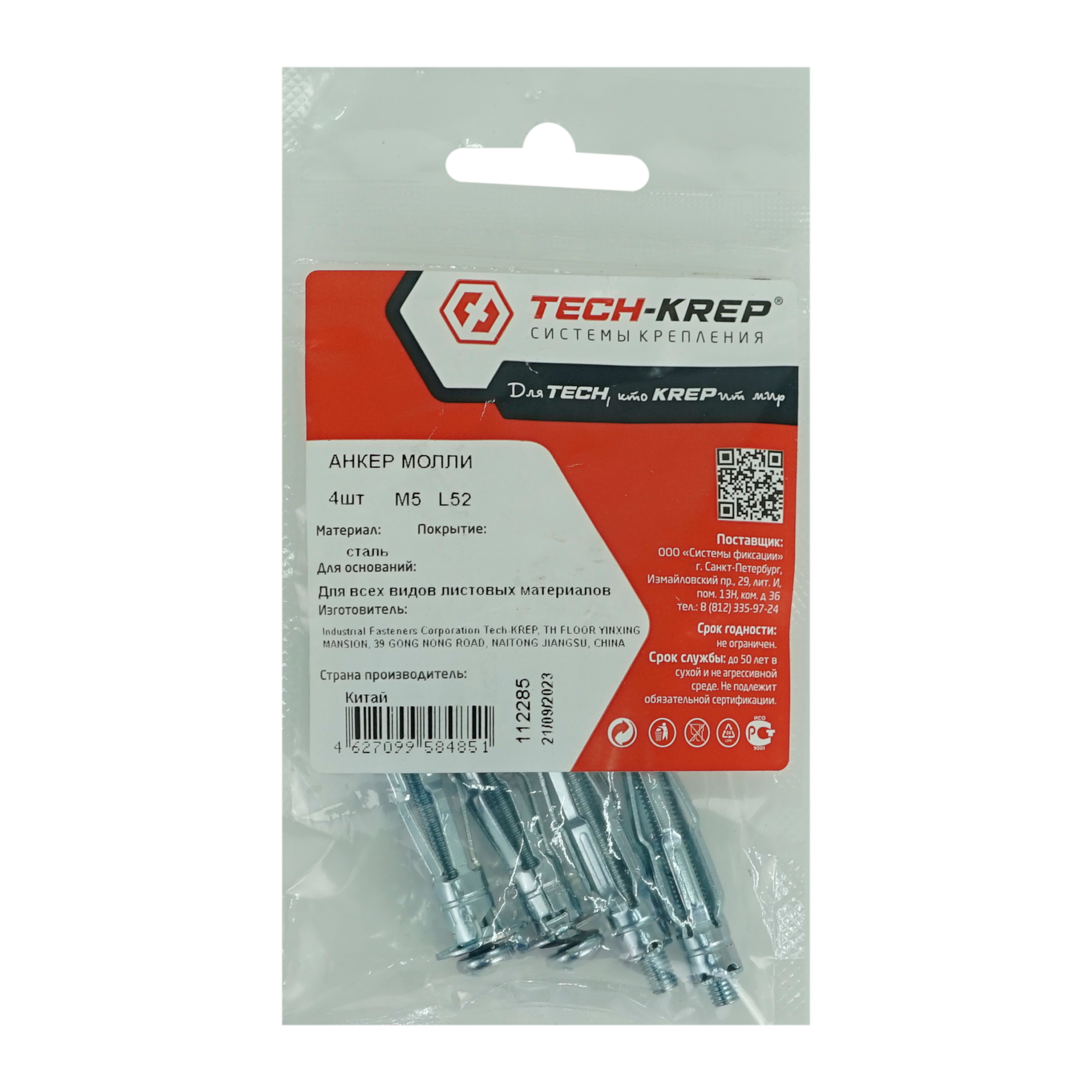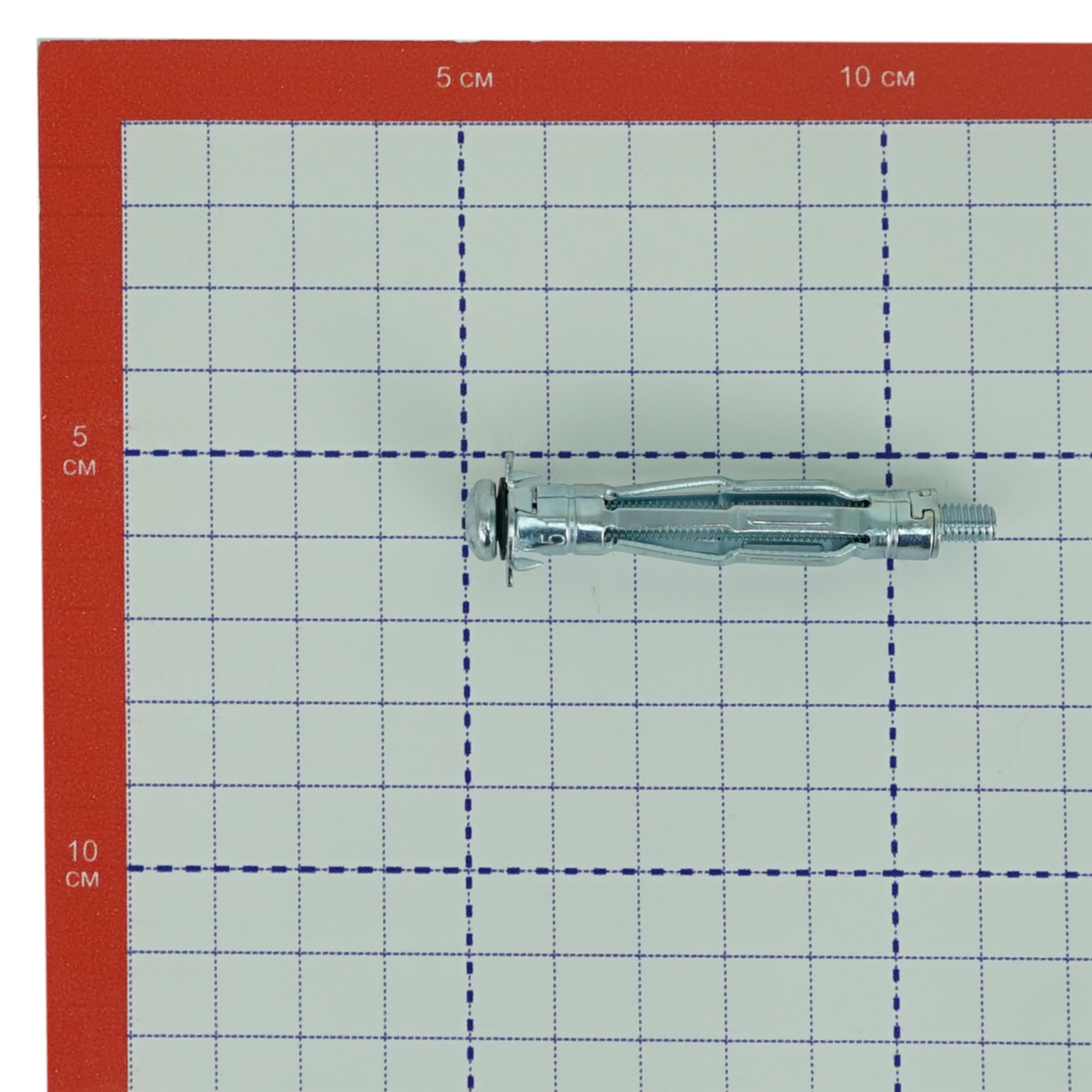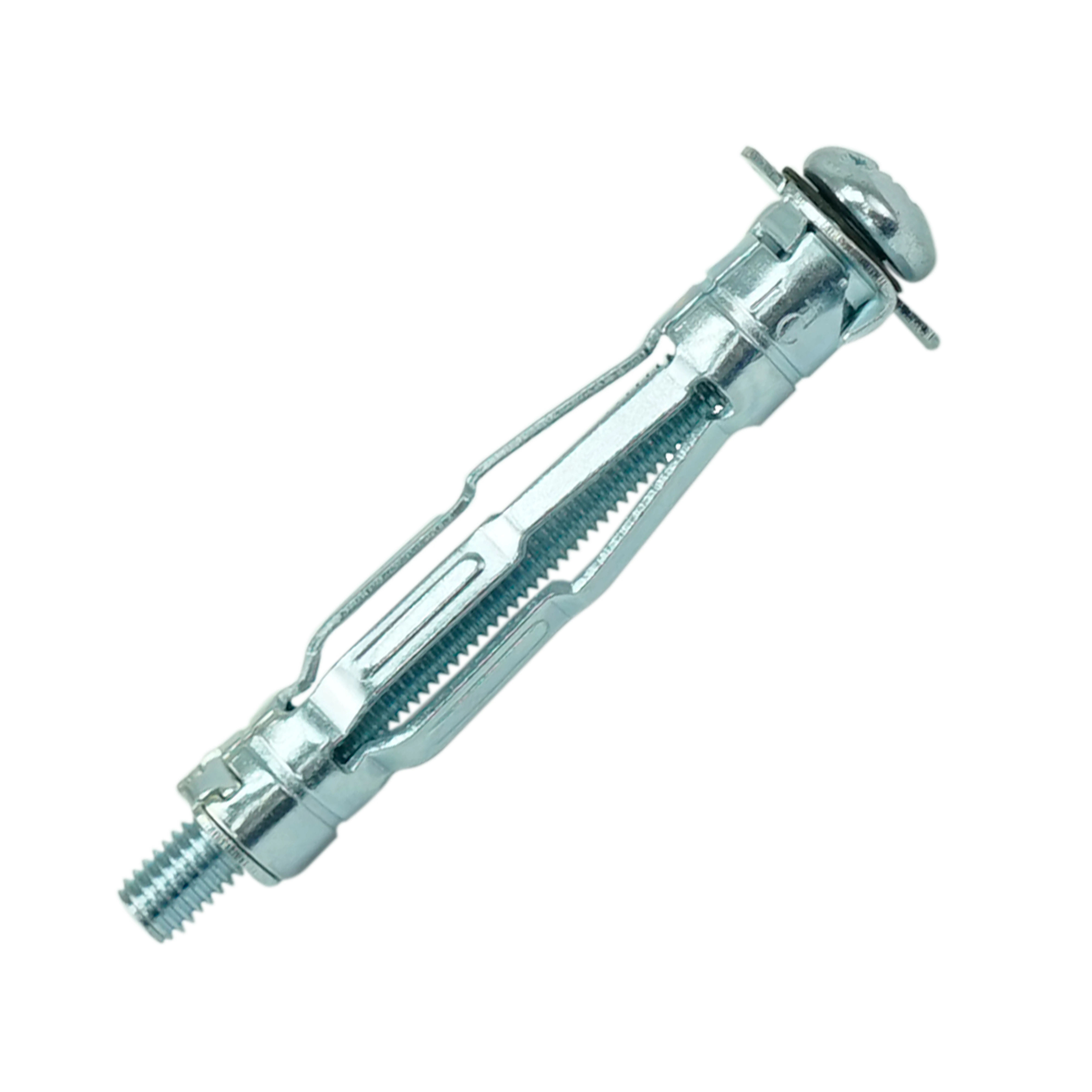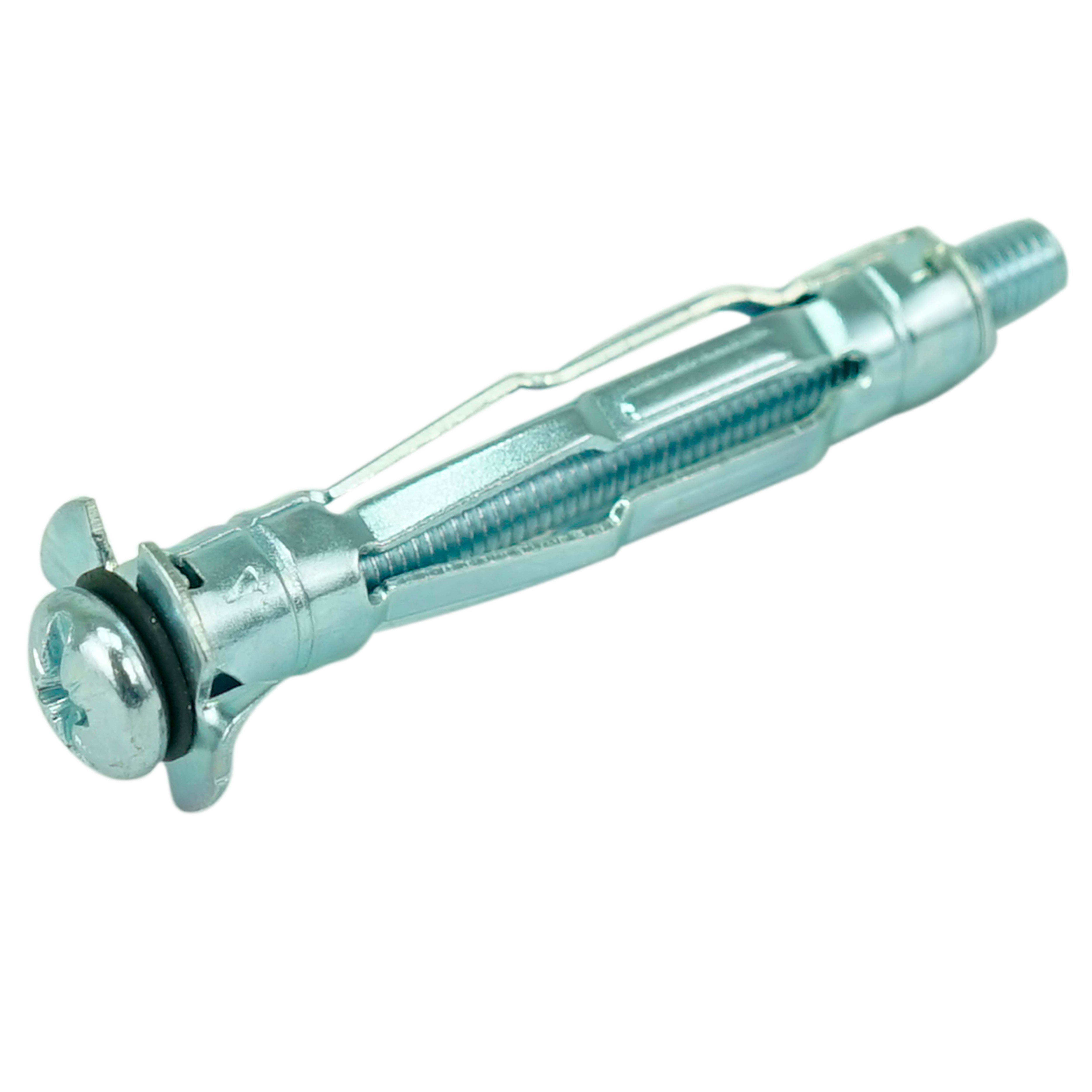 Дюбель Molly состоит из следующих элементов: полая втулка – цанга, которая имеет внутреннюю метрическую резьбу и продольные прорези в средней части, винт с метрической резьбой и полукруглой головкой с комбинированным шлицем SL и PZ, опорная шайба с двумя заостренными выступами – зубцами. Дюбель изготовлен из углеродистой стали с антикоррозионным цинковым покрытием.