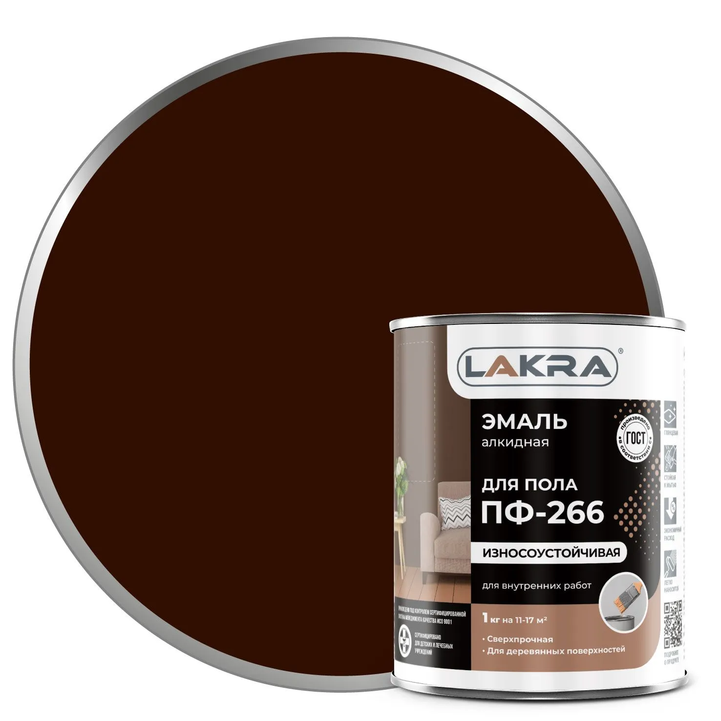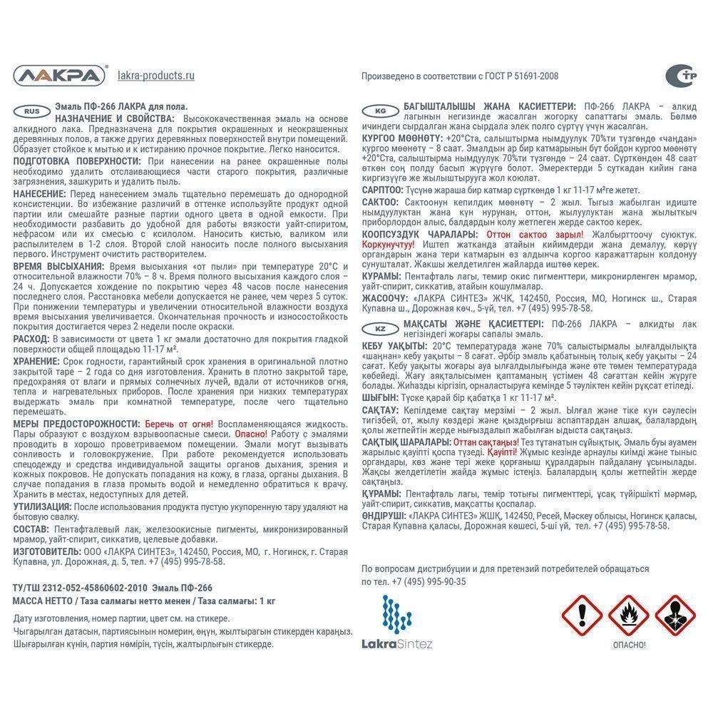 Эмаль Лакра для пола - высококачественная эмаль на основе алкидного лака. Эмаль для пола Лакра образует полуглянцевую поверхность, стойкую к механическим воздействиям, влаге и истиранию. Она отличается высокими декоративными и защитными свойствами, стойкая к мытью. Эмаль готова к применению. Быстро высыхает.