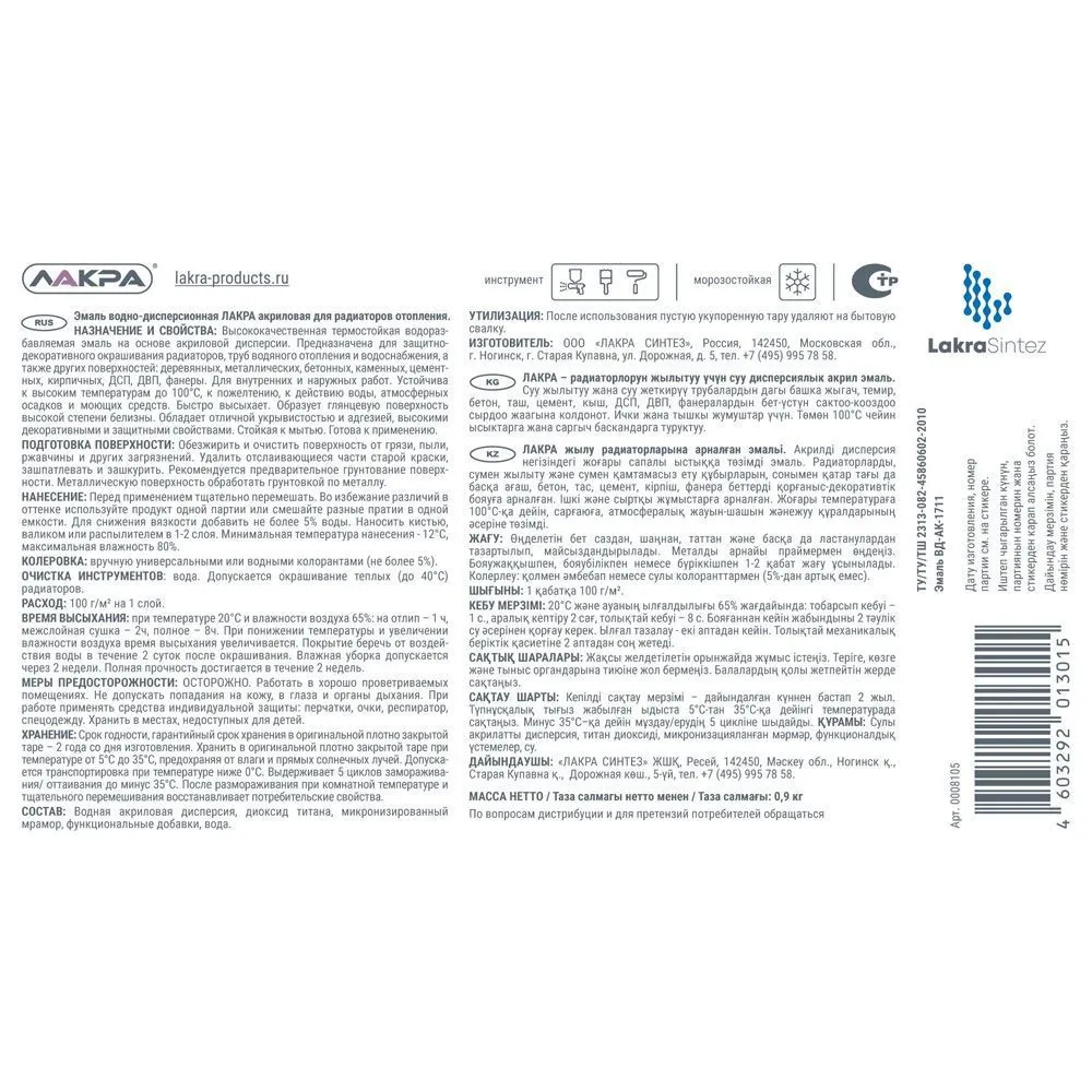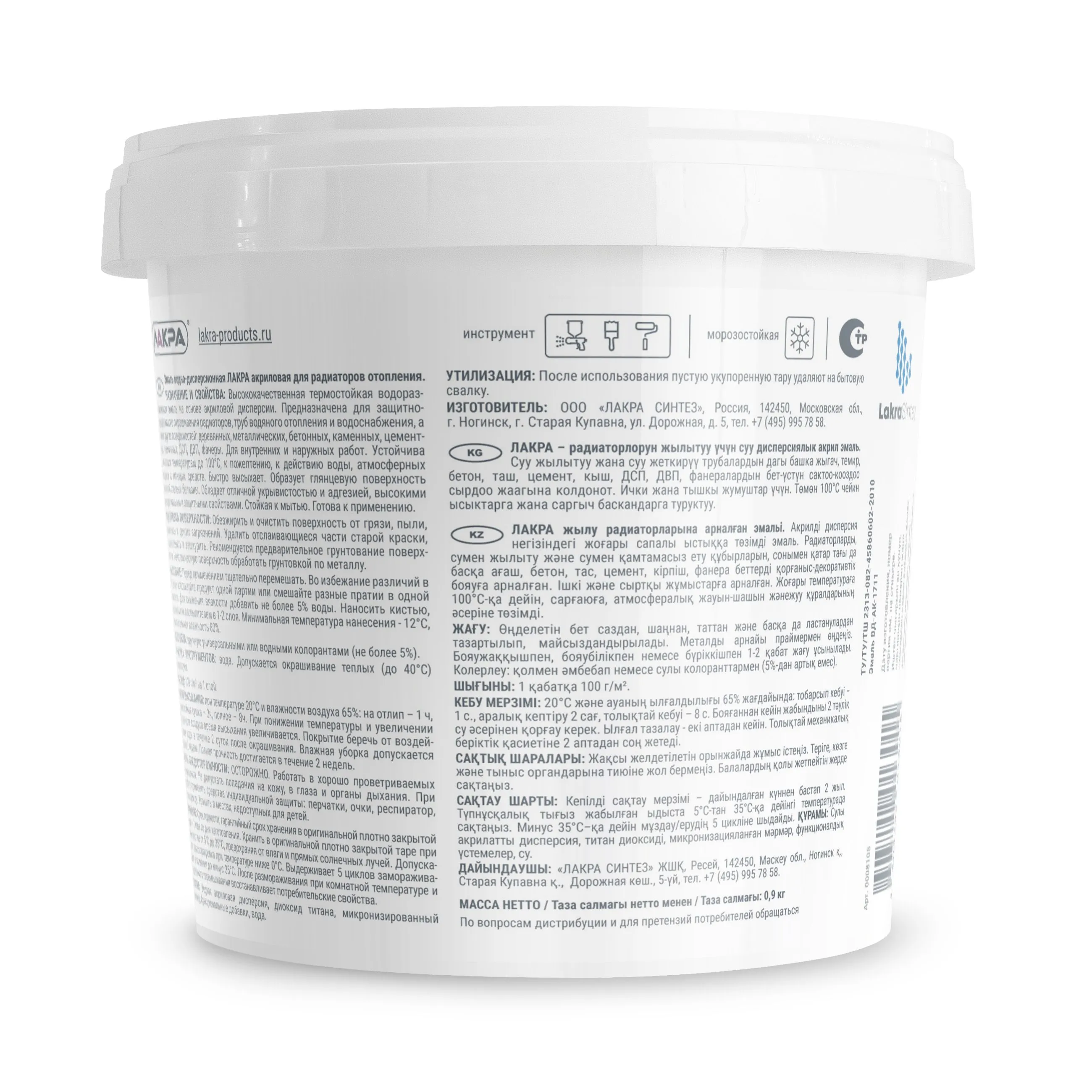 Эмаль акриловая лакра для радиаторов белая, глянцевая, 0,9 кг