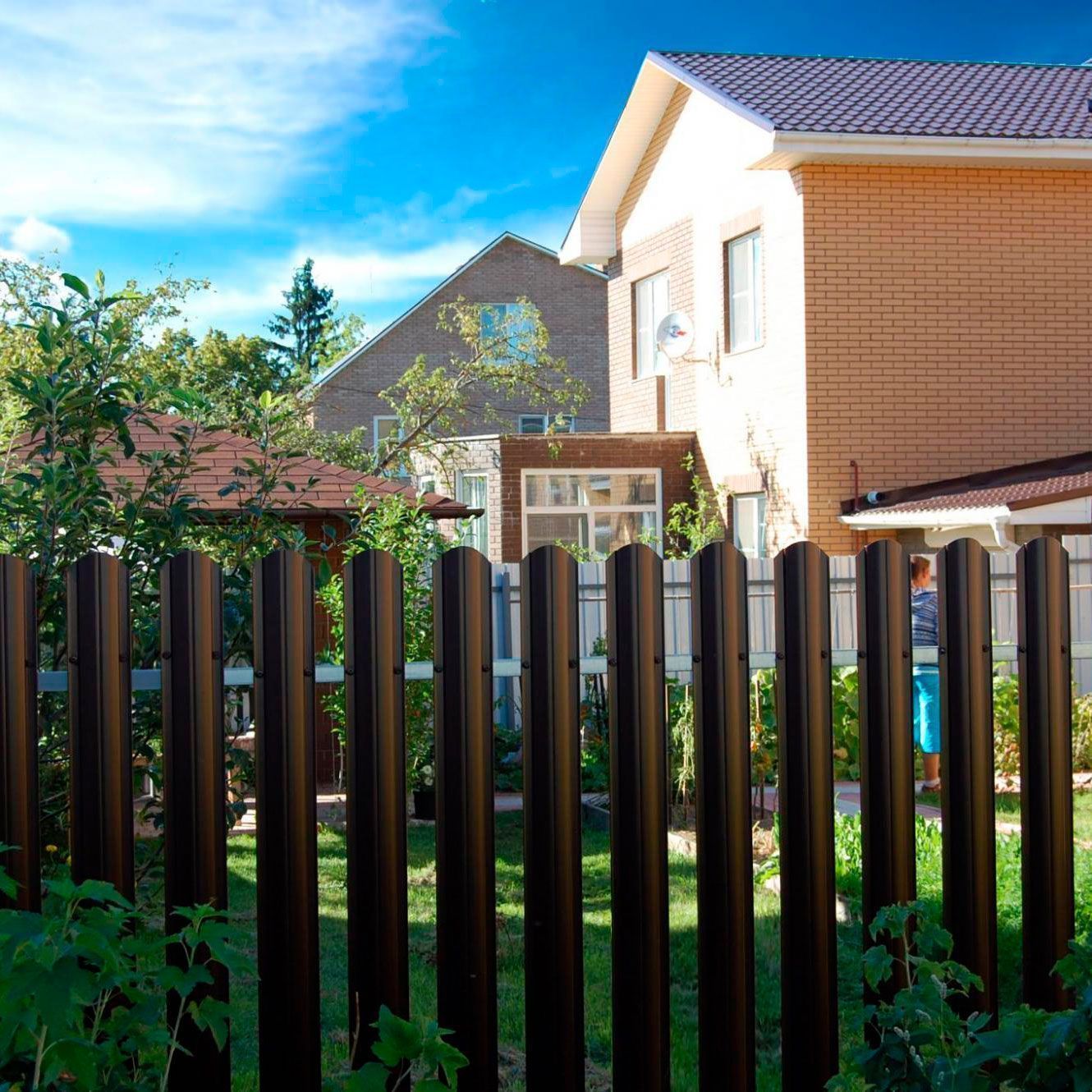 Закругленный край и средняя ширина позволяют забору из штакетника "Кантри" гармонично сочетаться с домами (коттеджами) среднего размера.
