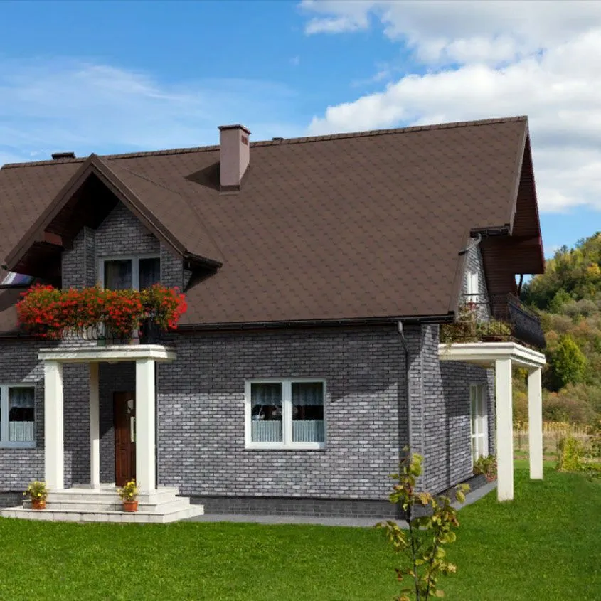 Фасадная плитка HAUBERK – облицовочный материал, изготовленный из биостойкого стеклохолста, улучшенного битума и гранулята из цветного натурального базальта