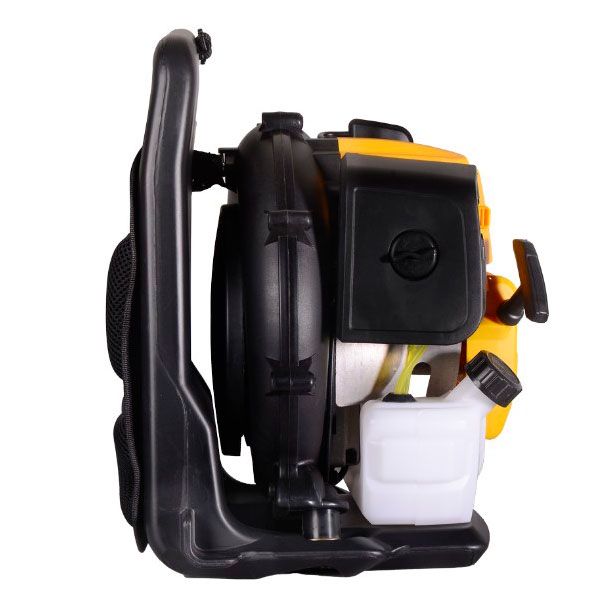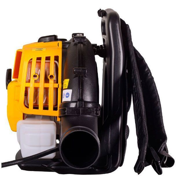 Бензиновая воздуходувка предназначена для подачи большого объема воздуха. Принцип работы устроен таким образом, что крутящий момент от вращающегося вала двигателя передается на крыльчатку вентилятора.