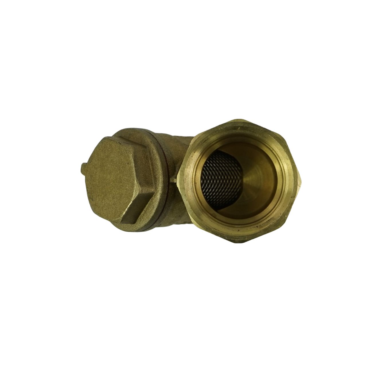 Фильтр косой 1" вн/вн с внутренней резьбой снабжен съемной пробкой-заглушкой, благодаря чему имеется возможность легко удалить отфильтрованные частицы из устройства. Сетчатый фильтр изготовлен из высококачественной горячепрессованной латуни и имеет никелированное покрытие. Фильтроэлемент изготавливается из нержавеющей стали, размер ячейки фильтрующего сетчатого элемента 500 мкм.