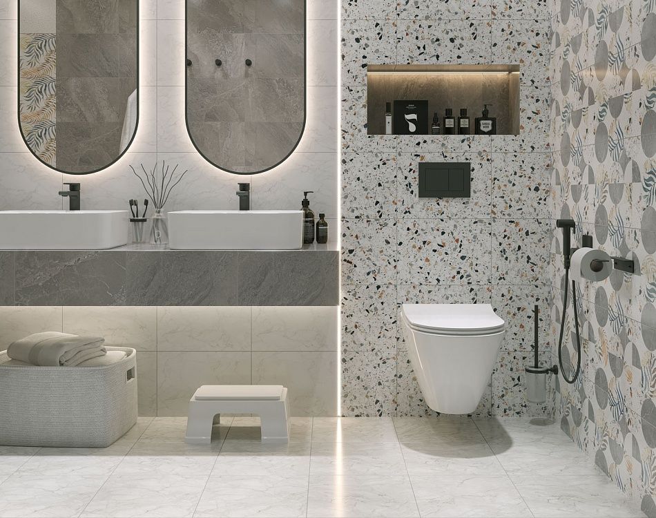Керамическая плитка Флорида торговой марки Axima — пример удачного сочетания природного рисунка мрамора калакатта и элементов с графическим дизайном. В составе коллекции присутствует фоновая плитка бело-серого мрамора, серого структурированного камня и плитка, визуально разделённая на восемь квадратов, с нанесением рельефных волнообразных линий.