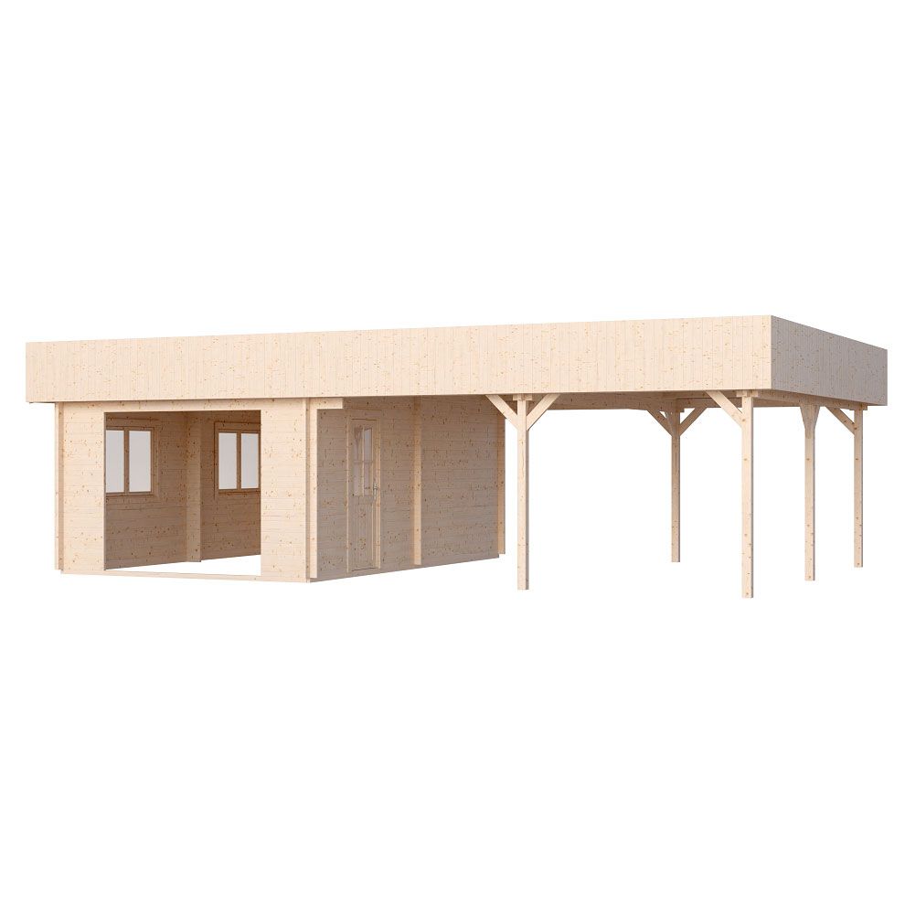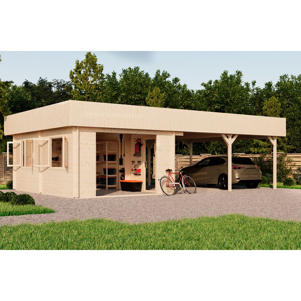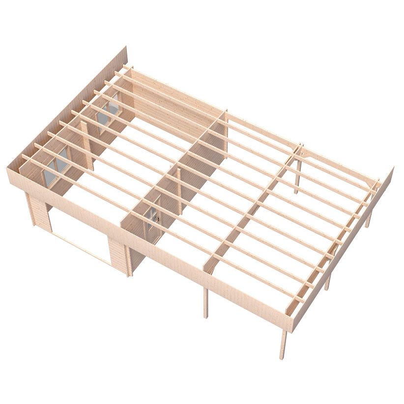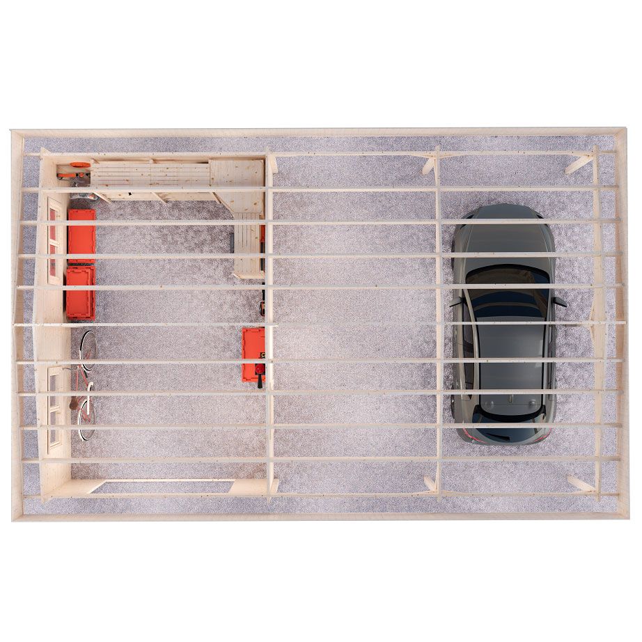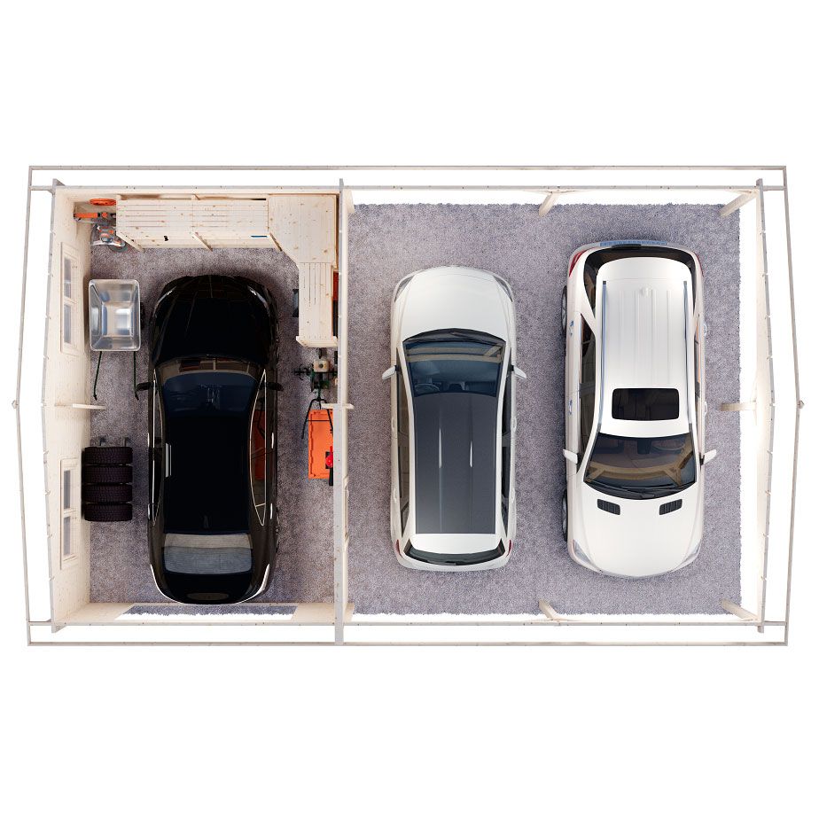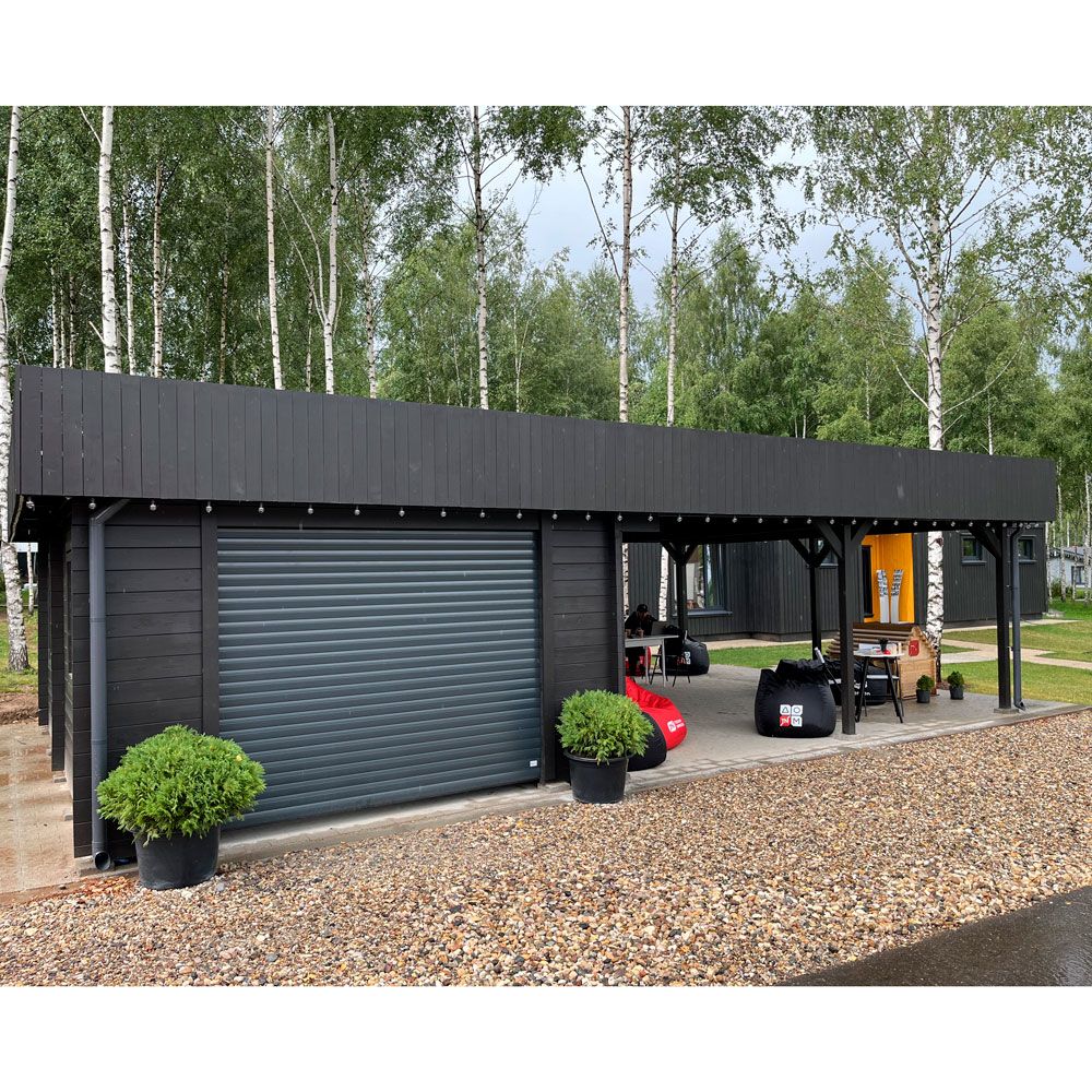 Вместительный гараж 6×9,5 м площадью 52 м² объединяет в себе две площадки под одной скатной кровлей, скрытой за парапетом. Закрытая часть рассчитана на один автомобиль и оснащена двумя распашными окнами для естественного освещения и отдельным входом со стороны навеса. Открытая часть под навесом вмещает два автомобиля. Это решение для тех, кто ищет гибкое и функциональное пространство для парковки автомобилей и организации пространства.