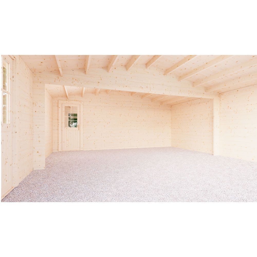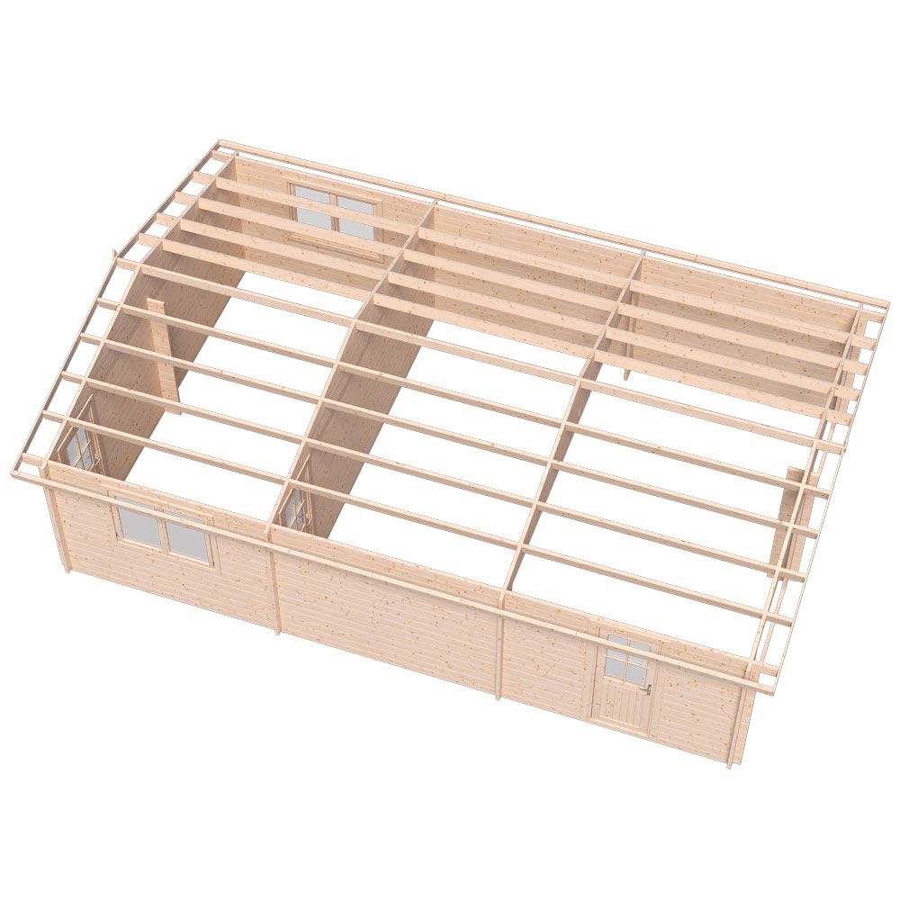 Стеновой брус, фронтон, фундаментная балка, доска крыши, балка крыши, карниз, усилитель карниза, декор, крепеж, 2 двери, 2 окна, фурнитура.
