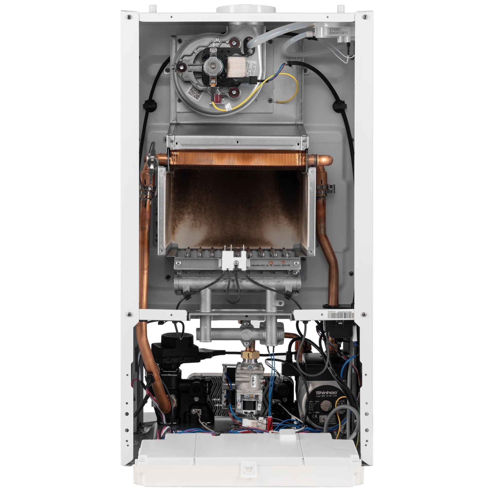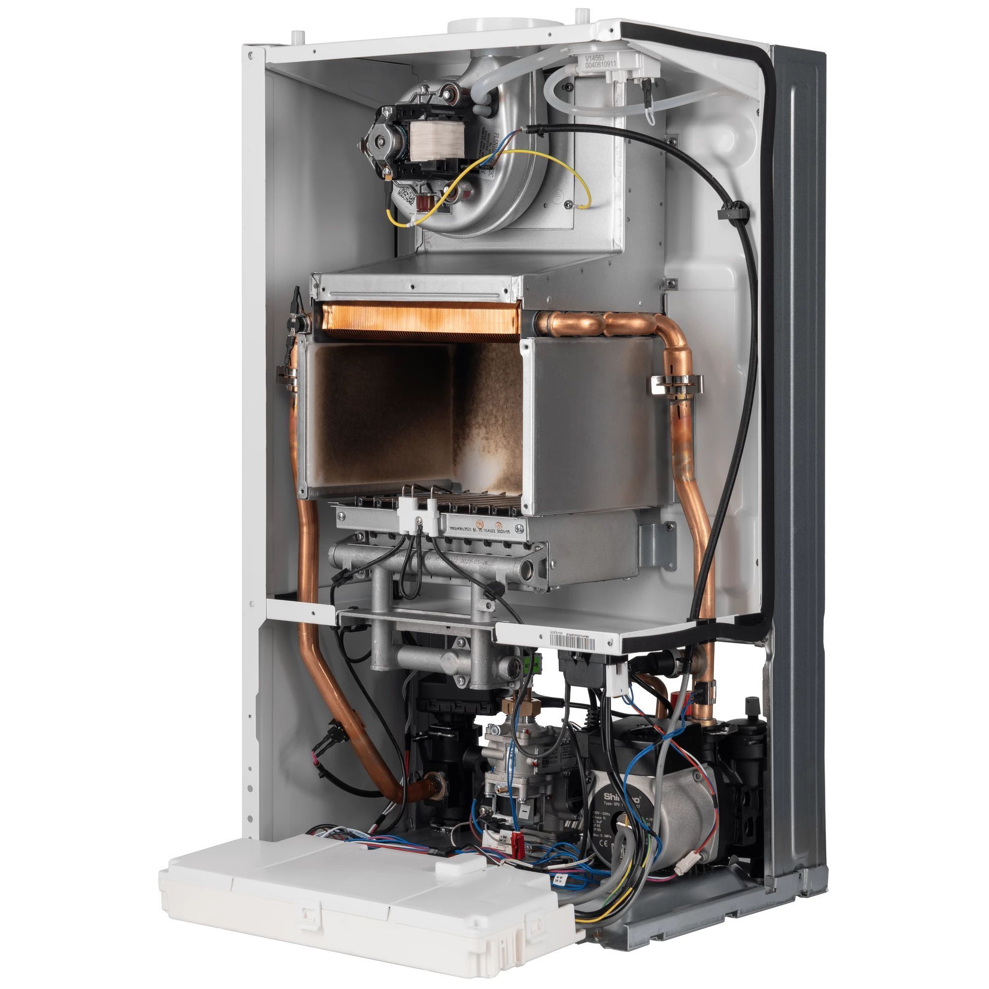 - Котел имеет высокоэффективный первичный теплообменник, изготовленный из бескислородной меди, который отличается высокой надежностью и модернизированной горелкой, работающей в широком диапазоне мощностей.