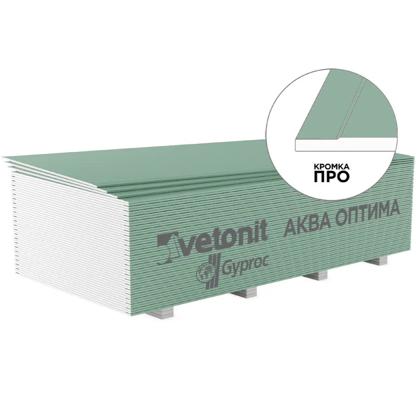 Гипсокартон Гипрок Аква Оптима – экологически чистый отделочный материал. Она состоит из гипсового сердечника со специальными добавками-гидрофобизаторами, облицованного особым картоном. Благодаря уникальной кромке PRO глубина выемки, которая образуется в месте соединения плит, составляет всего 1-1,5 мм. В этом случае для заделки стыка требуется минимальное количество шпаклевки, которая равномерным слоем распределяется по всему шву. Конструкции из гипсокартона Гипрок Аква Оптима легкие, прочные, паропроницаемые («дышат»), способны естественным образом регулировать влажность воздуха в помещении. Гипрок Аква Оптима не содержит вредных для здоровья веществ, состоит из полностью перерабатываемых материалов, безопасен для человека и окружающей среды. Экологическая безопасность продукции Gyproc подтверждена экомаркировкой «ЭкоМатериал».