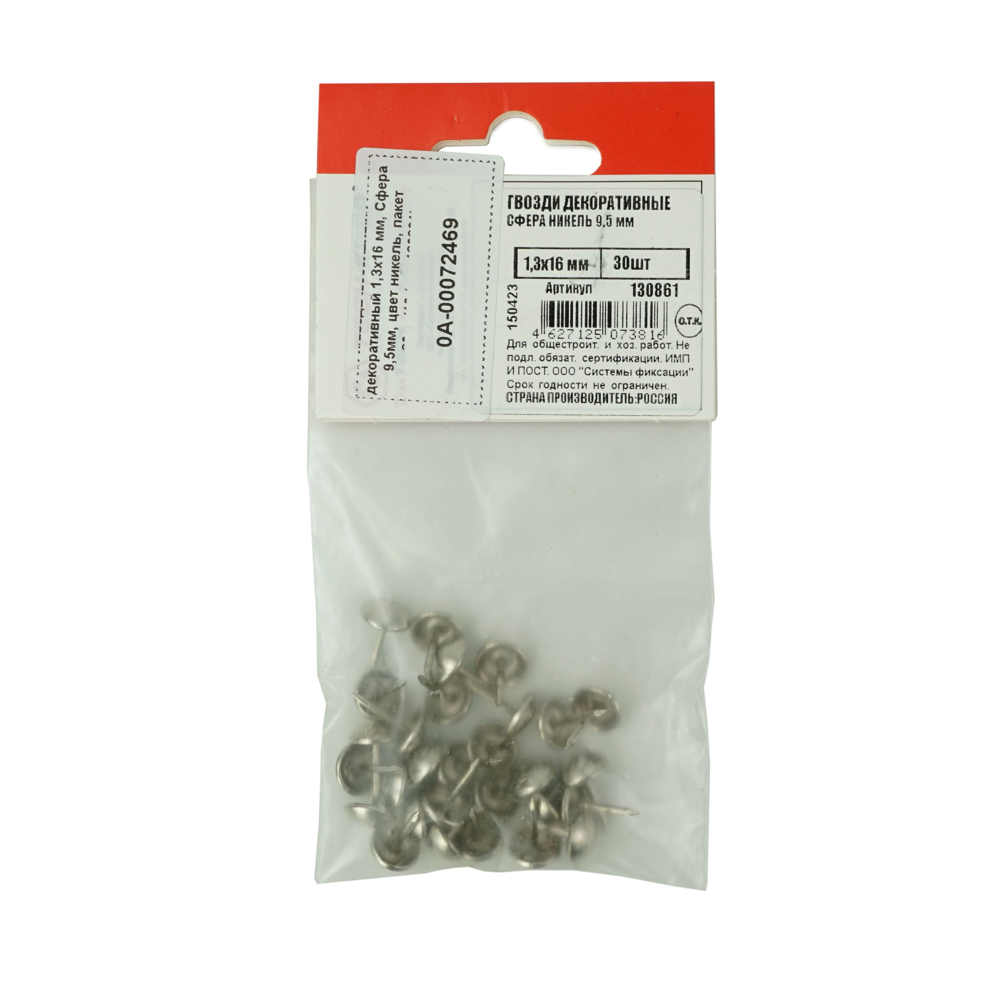 Гвоздь мебельный декоративный 1,3х16 мм, Сфера 9,5мм, цвет никель, пакет 30шт/10 (арт.130861)