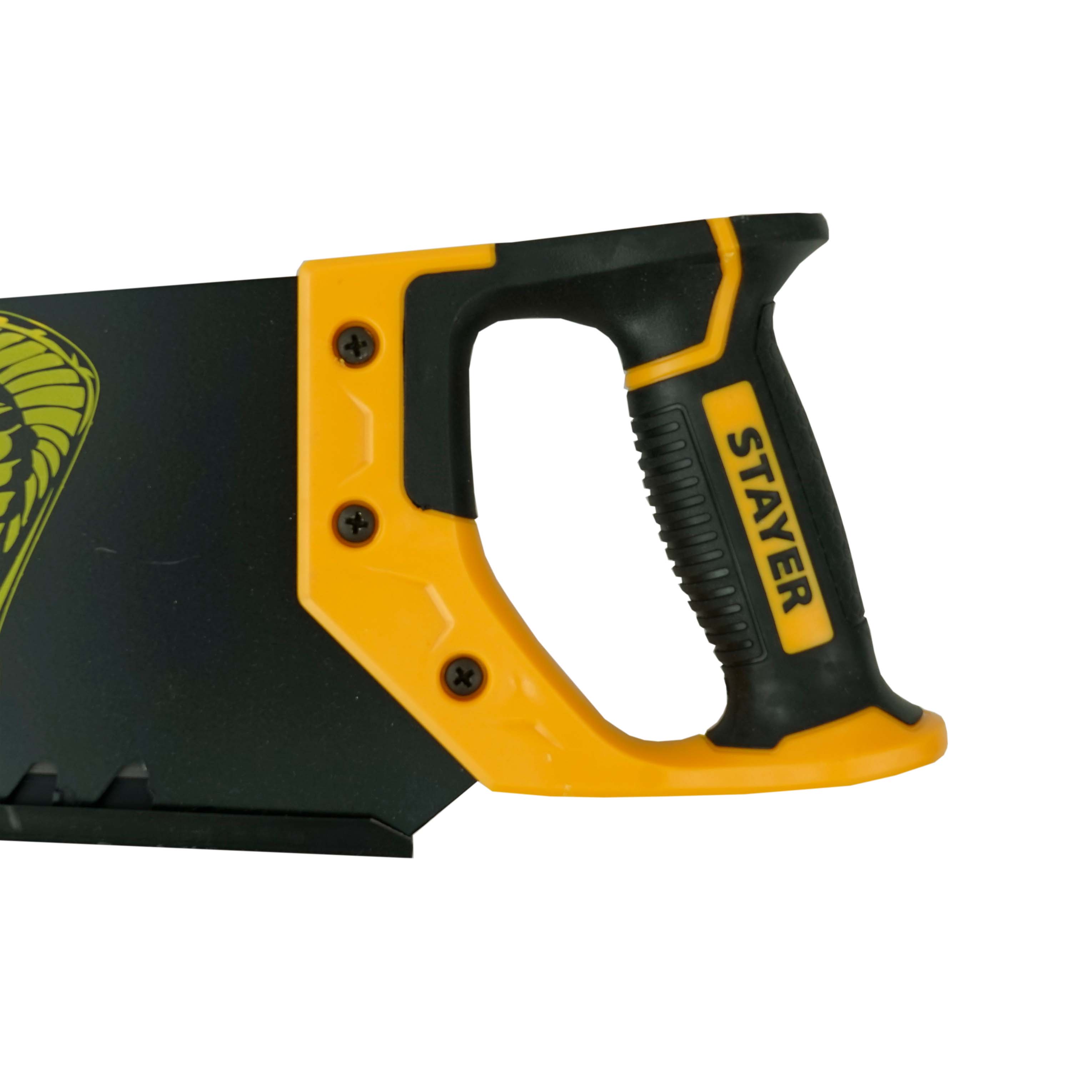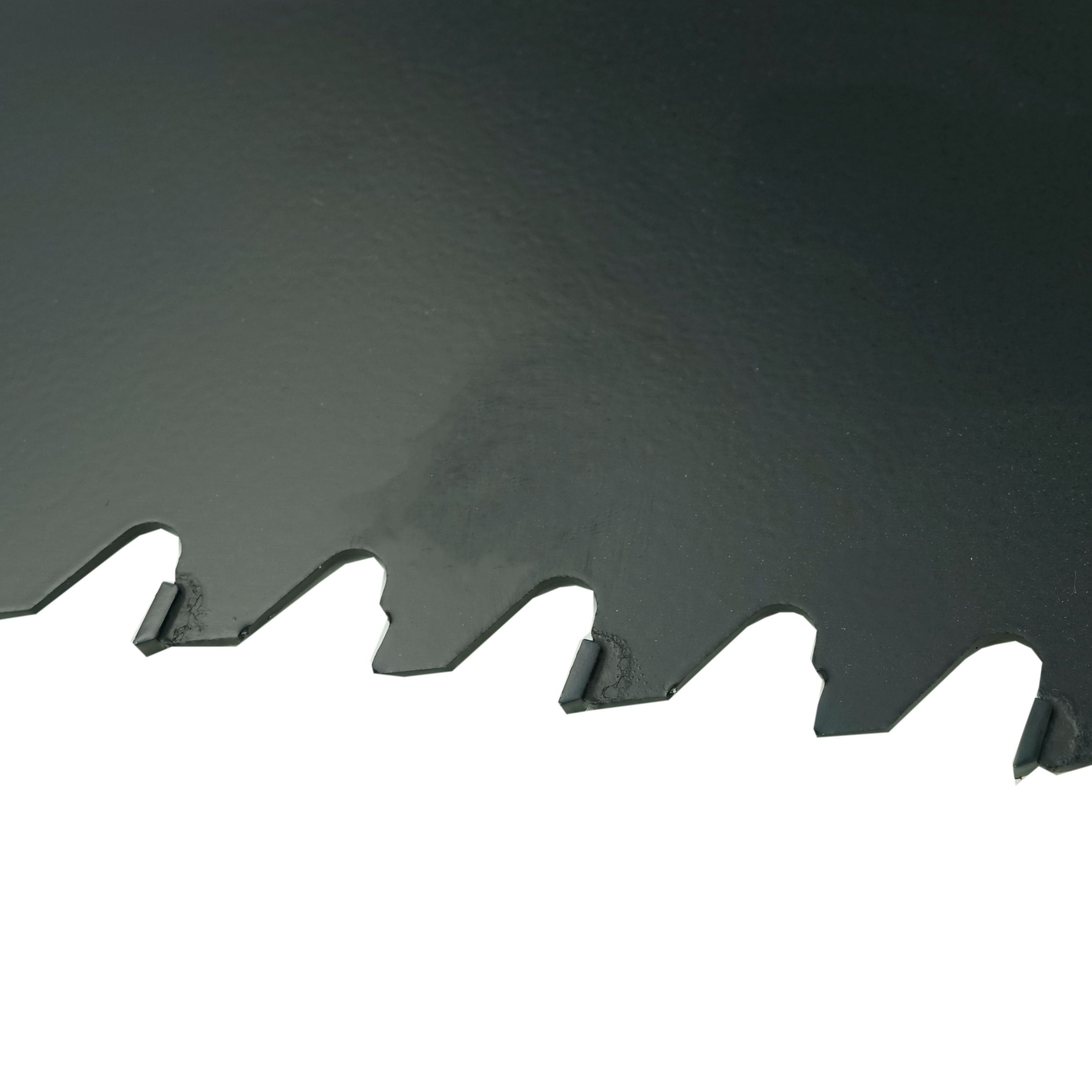 Специальные крупные зубья. Твердосплавные напайки на каждом втором зубе. Двухкомпонентная (резина + пластик) противоскользящая рукоятка.