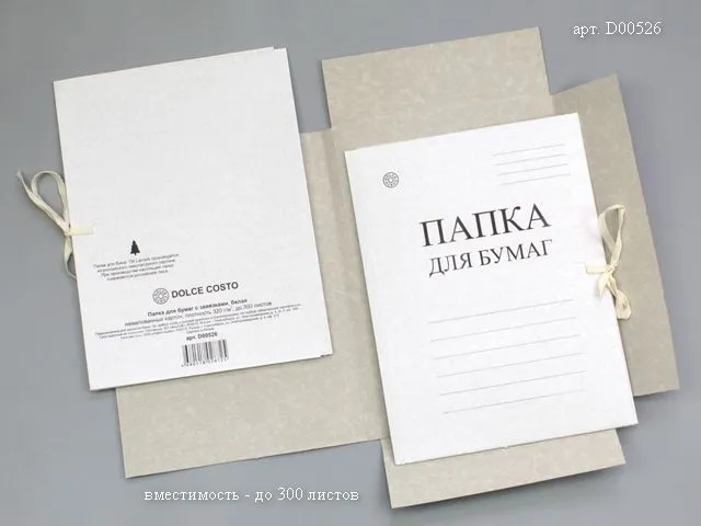 Папка для бумаг формата А4 с завязками изготовлена из немелованного картона белого цвета (плотность 260 г/кв. м), на лицевой стороне есть поля для подписывания.