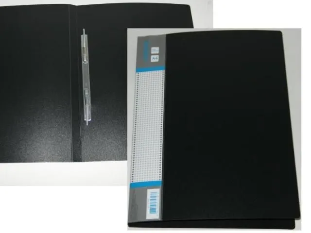 Папка изготовлена из гладкого пластика. Толщина верхнего прозрачного листа - 130 мкм, нижнего цветного листа - 180 мкм. С прозрачной верхней обложкой. На лицевой стороне находится карман с белым бумажной полосой для указания содержания, вместимость - 100 листов стандартной плотности.