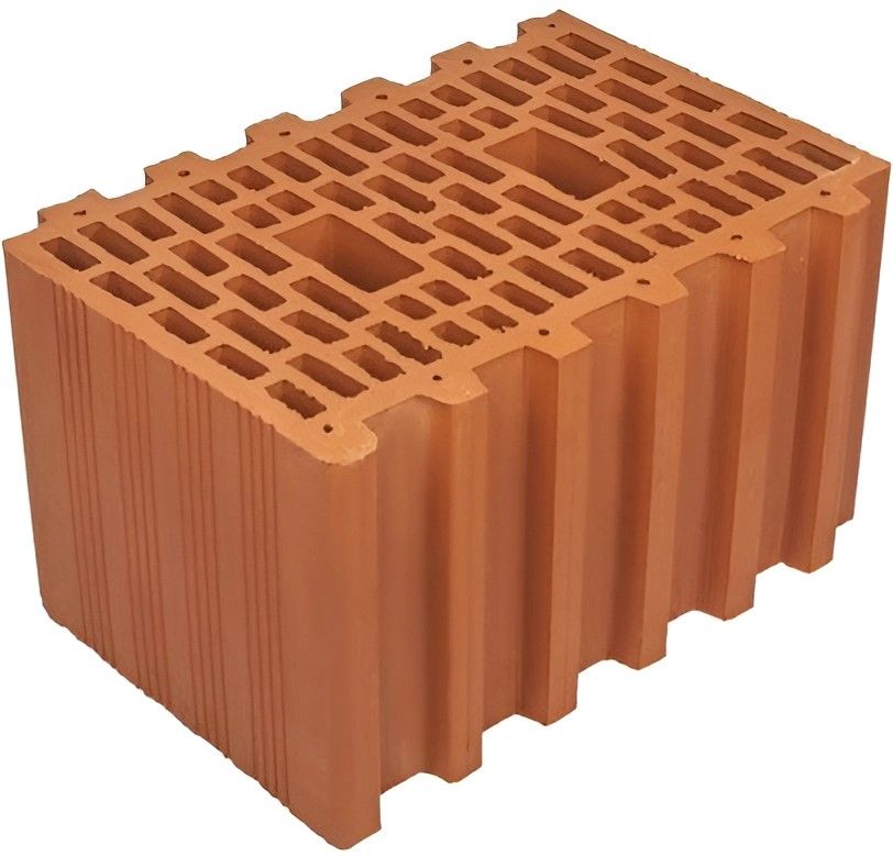 Блок керамический поризованный изготавливается путем введения в шихту опилок (или иных сгорающих заполнителей), выгорающих при обжиге и оставляющих в блоке поры или пустоты, составляющие 13-33% от объема изделия. Это позволяет облегчить строительный материал и самое главное – уменьшить коэффициент теплопроводности изделия в 2-2,5 раза по сравнению с традиционным керамическим кирпичом. Все крупноформатные поризованные блоки имеют щелевидную форму пустот. Один блок способен заменять в кладке до 15 кирпичей стандартного формата.