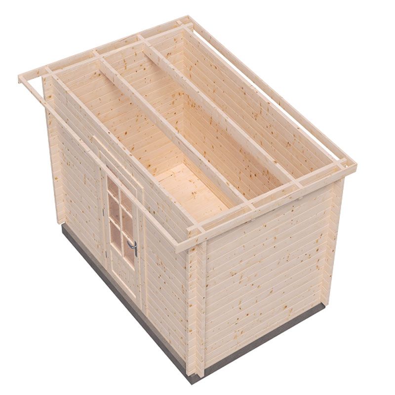 Стеновой брус, фронтон, доска пола, фундаментная балка, плинтус, доска крыши, балка крыши, карниз, усилитель карниза, крепеж, дверь остекленная, фурнитура.