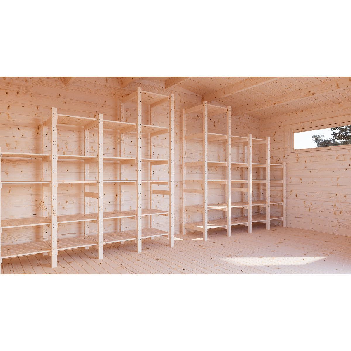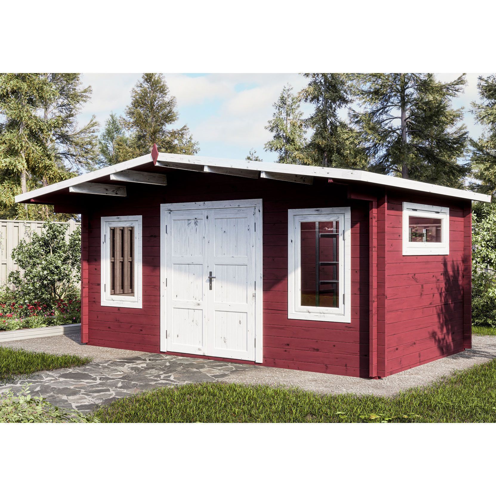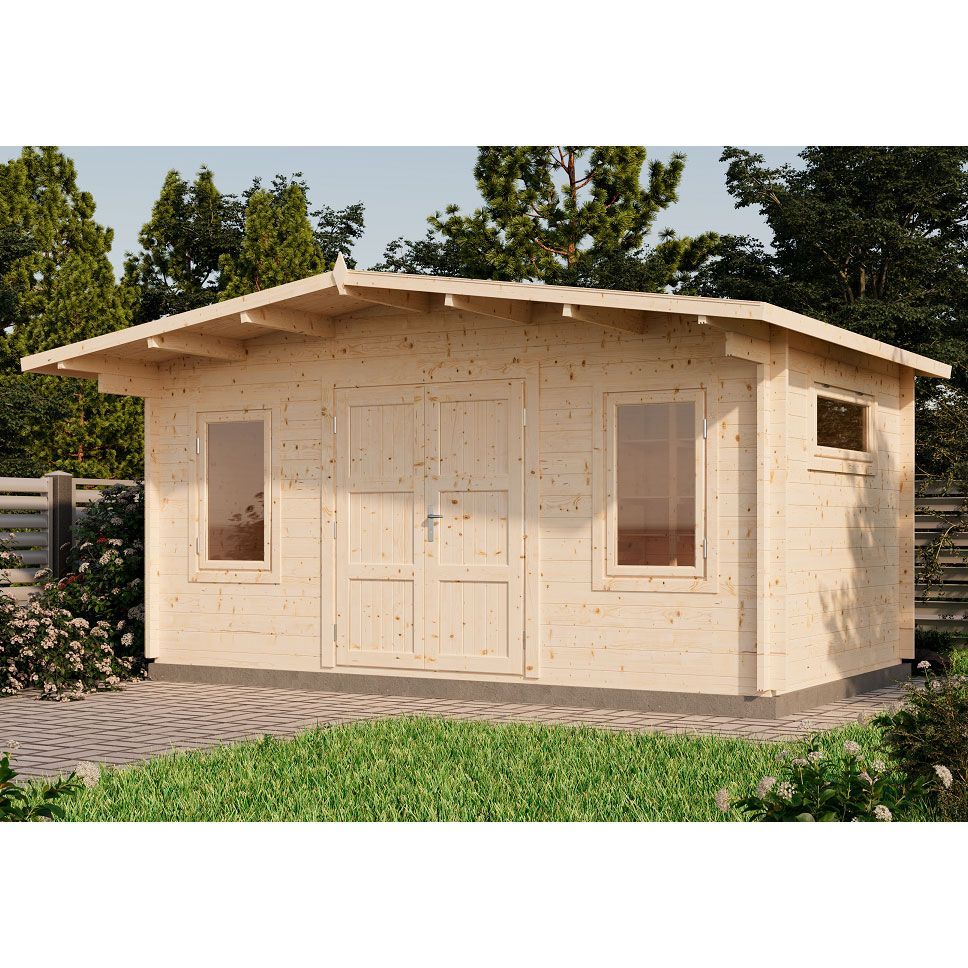 Хозблок 5×3 м начинается со входа — и этот вход впечатляет. Широкий фронтальный свес позволяет создать комфортную тень и защиту от осадков. Благодаря трем окнам в помещении достаточно света. Распашные двери можно будет открыть даже в дождливый день, чтобы с комфортом поработать за верстаком, столом, или организовать хранение на большой площади 12,9 м².
