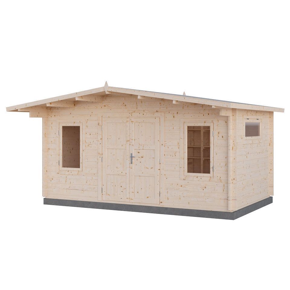 Хозблок 5×3 м начинается со входа — и этот вход впечатляет. Широкий фронтальный свес позволяет создать комфортную тень и защиту от осадков. Благодаря трем окнам в помещении достаточно света. Распашные двери можно будет открыть даже в дождливый день, чтобы с комфортом поработать за верстаком, столом, или организовать хранение на большой площади 12,9 м².