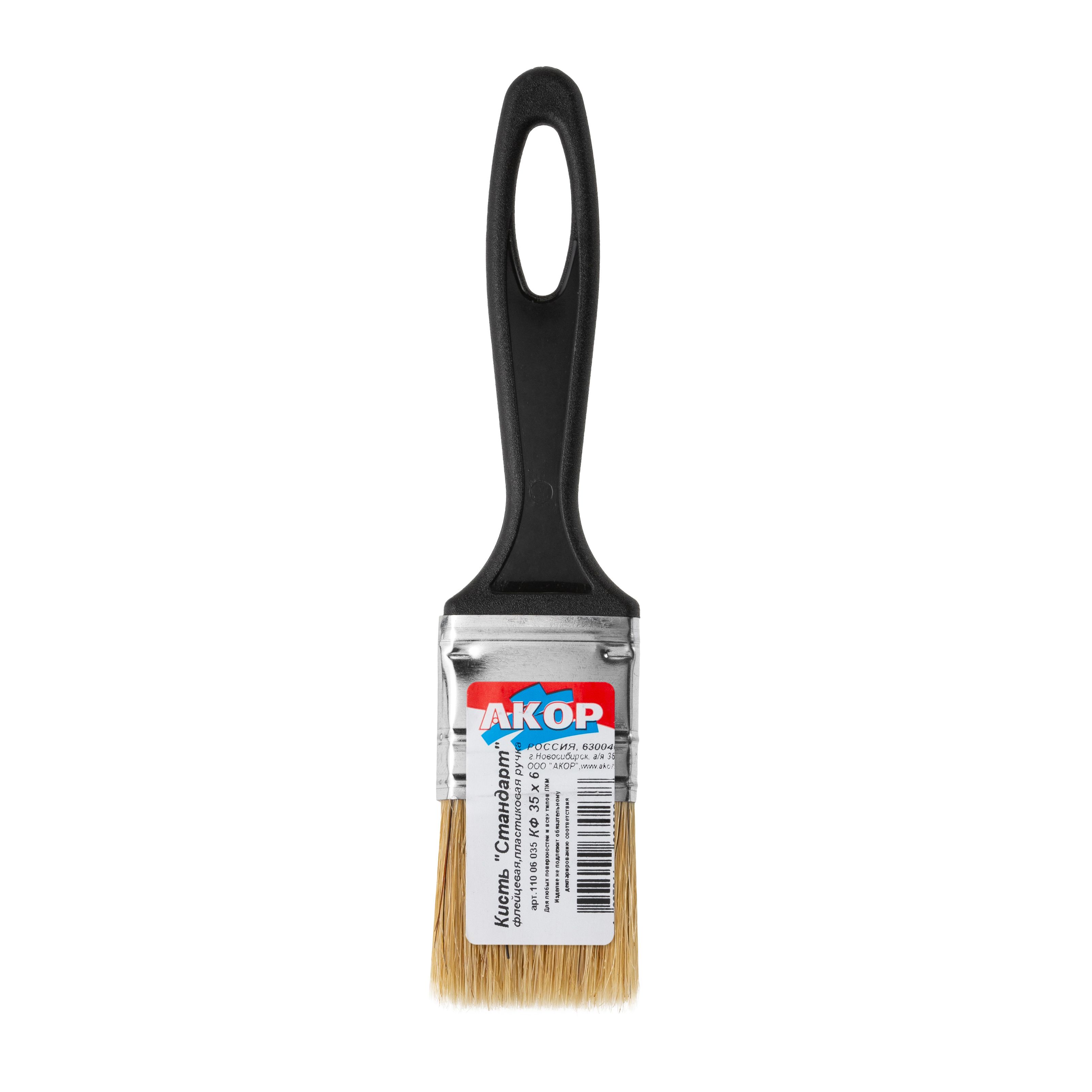 Кисть плоская Стандарт (АКОР) натуральная щетина, черная пластиковая ручка. Идеальный инструмент для качественного окрашивания. Рукоятка оснащена отверстием для подвешивания.
