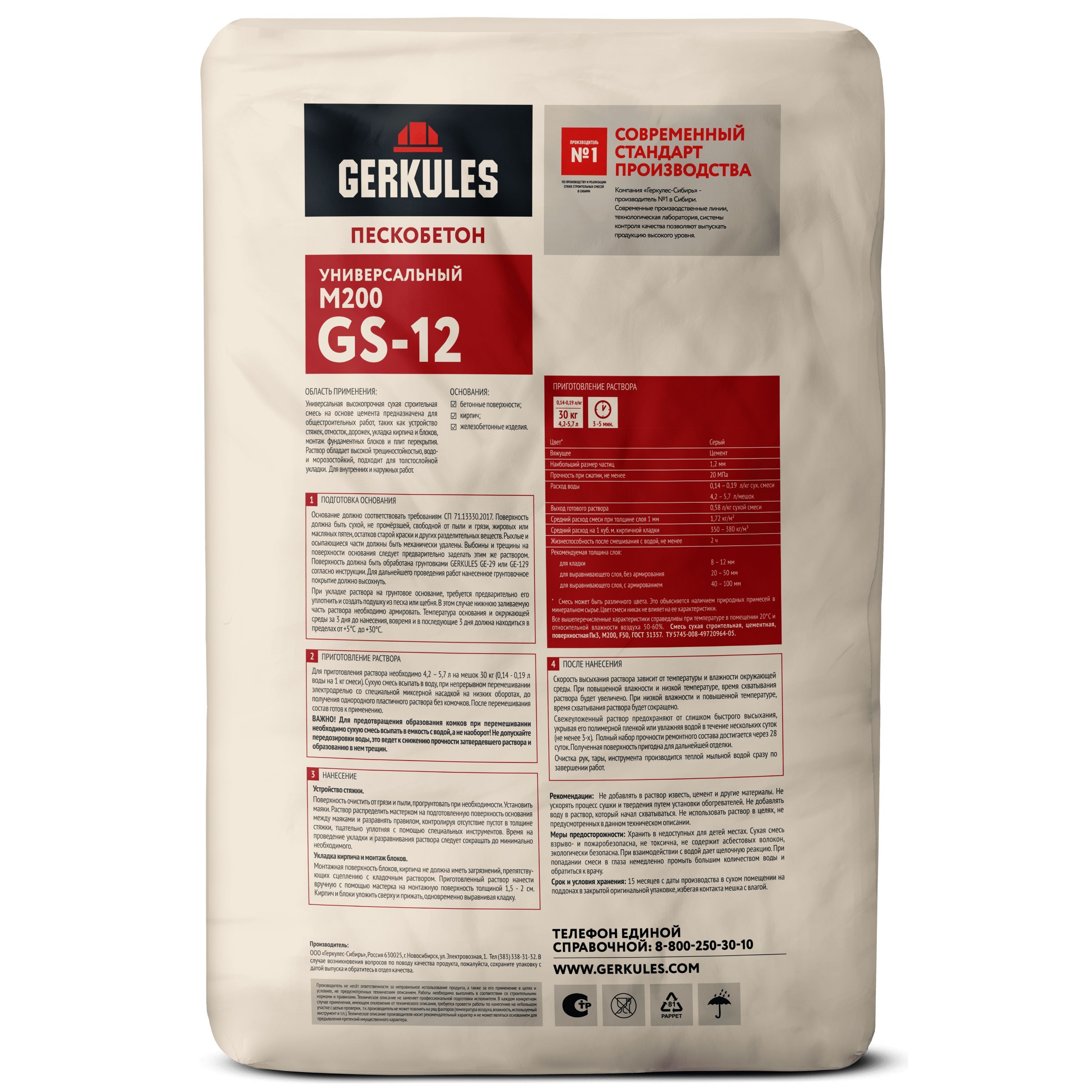 Свойства: Песокобетон М200 «Геркулес» GS-12 представляет собой сухую смесь на основе мелкозернистого плотного заполнителя, кварцевого песка и портландцемента.
