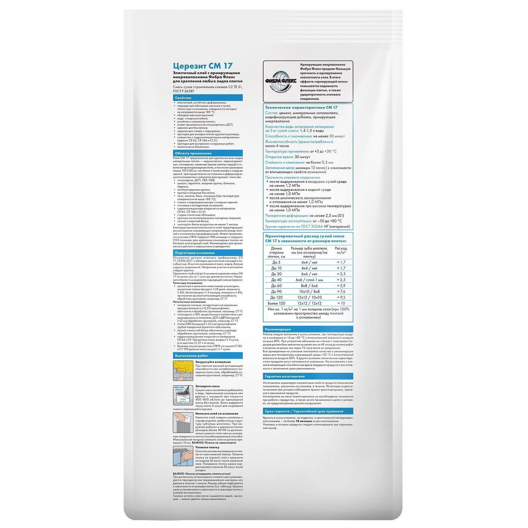 Клей СМ 17 Super Flex предназначен для крепления всех видов минеральных плиток: керамических, керамогранитных, клинкерных, каменных (кроме мраморных) и т. п., на стенах и полах внутри и снаружи зданий, преимущественно на сложных и деформирующихся основаниях и элементах конструкций, таких как: