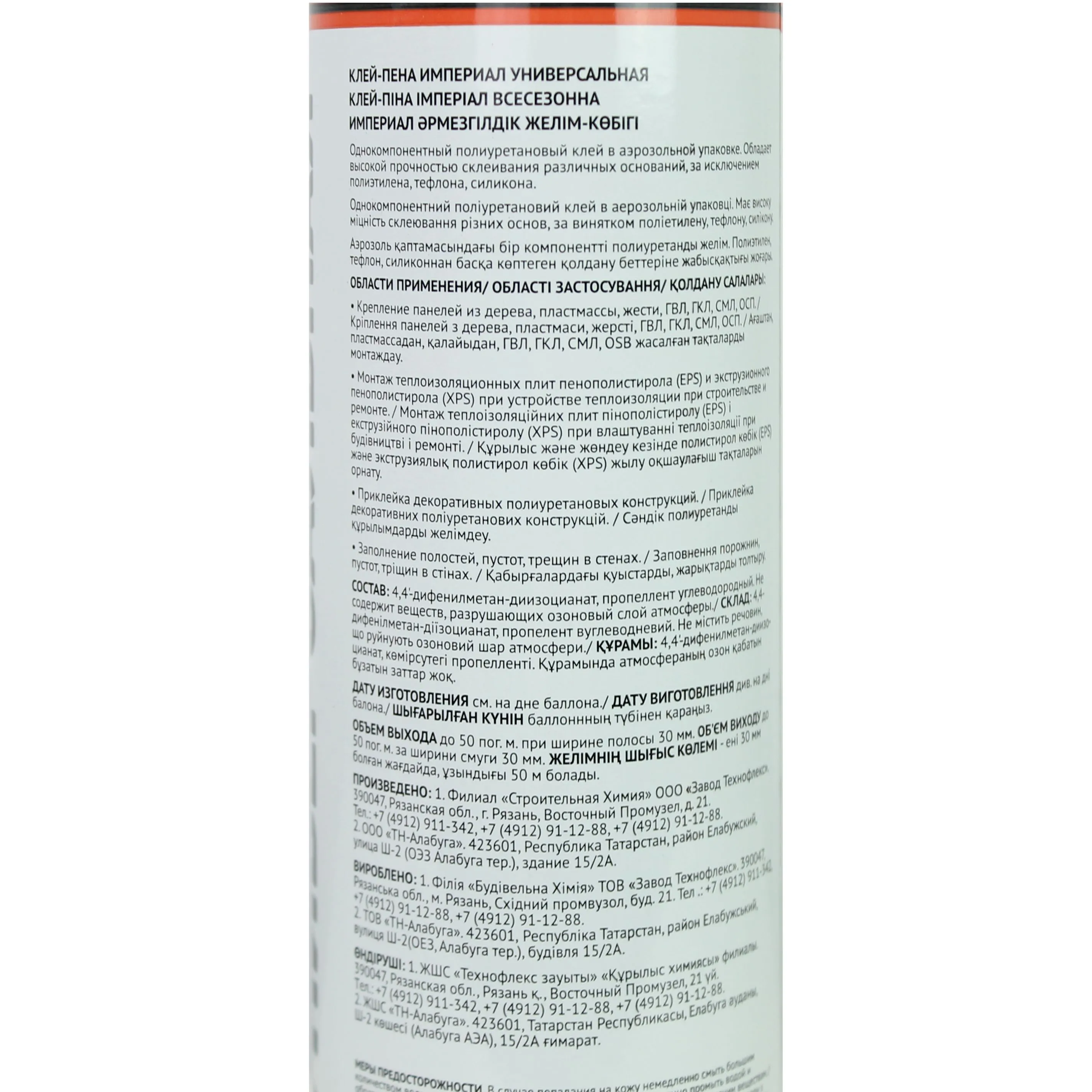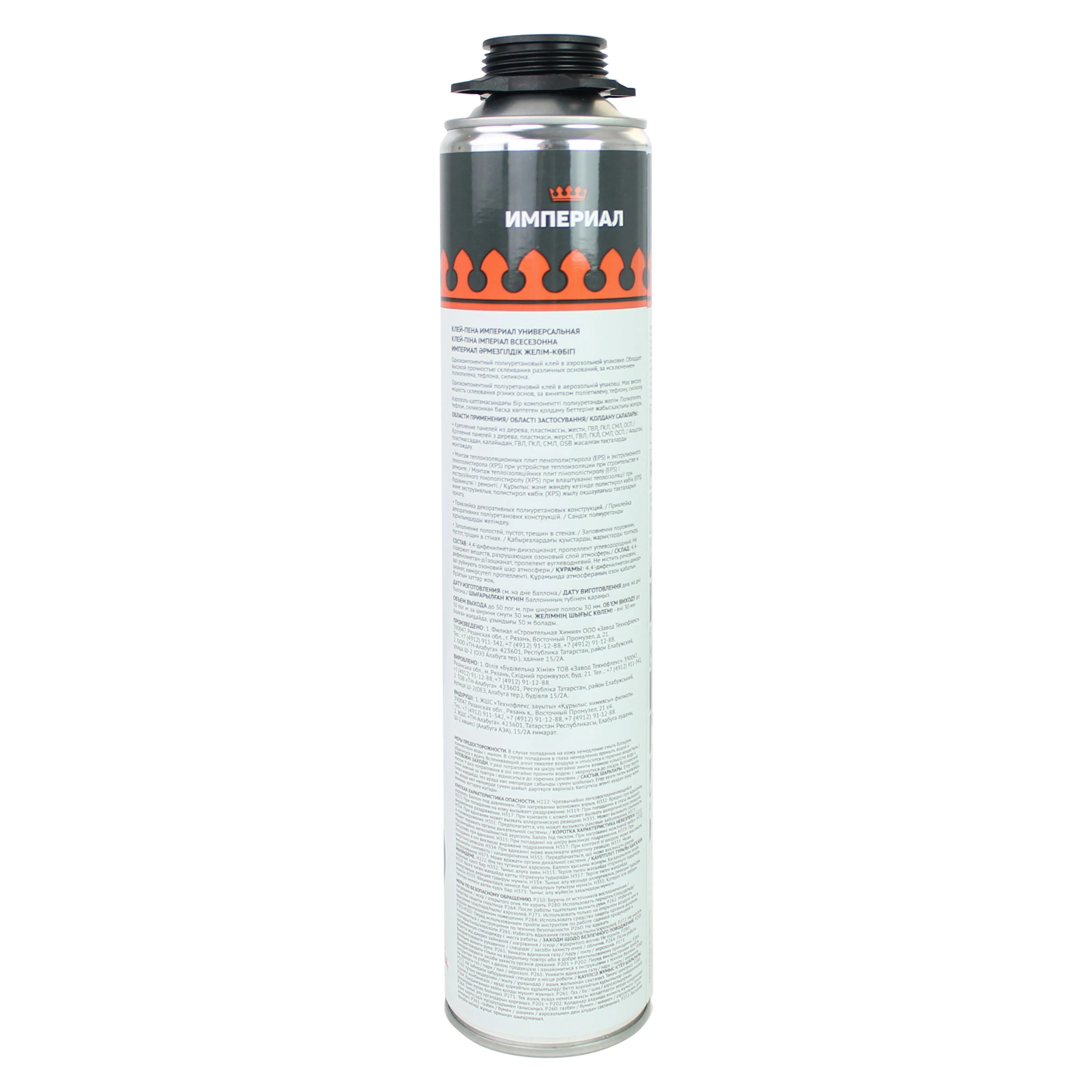 Клей-пена Империал Универсальная всесезонная представляет собой однокомпонентный полиуретановый материал в аэрозольной упаковке. Монтажная пена отличается умеренным первичным расширением, низким вторичным расширением. Пена обладает хорошей адгезией к большинству строительных материалов (для OSB, дерева, XPS, пенопласта, минеральной ваты, гипсокартона, жести), за исключением тефлона, силикона и полиэтилена.