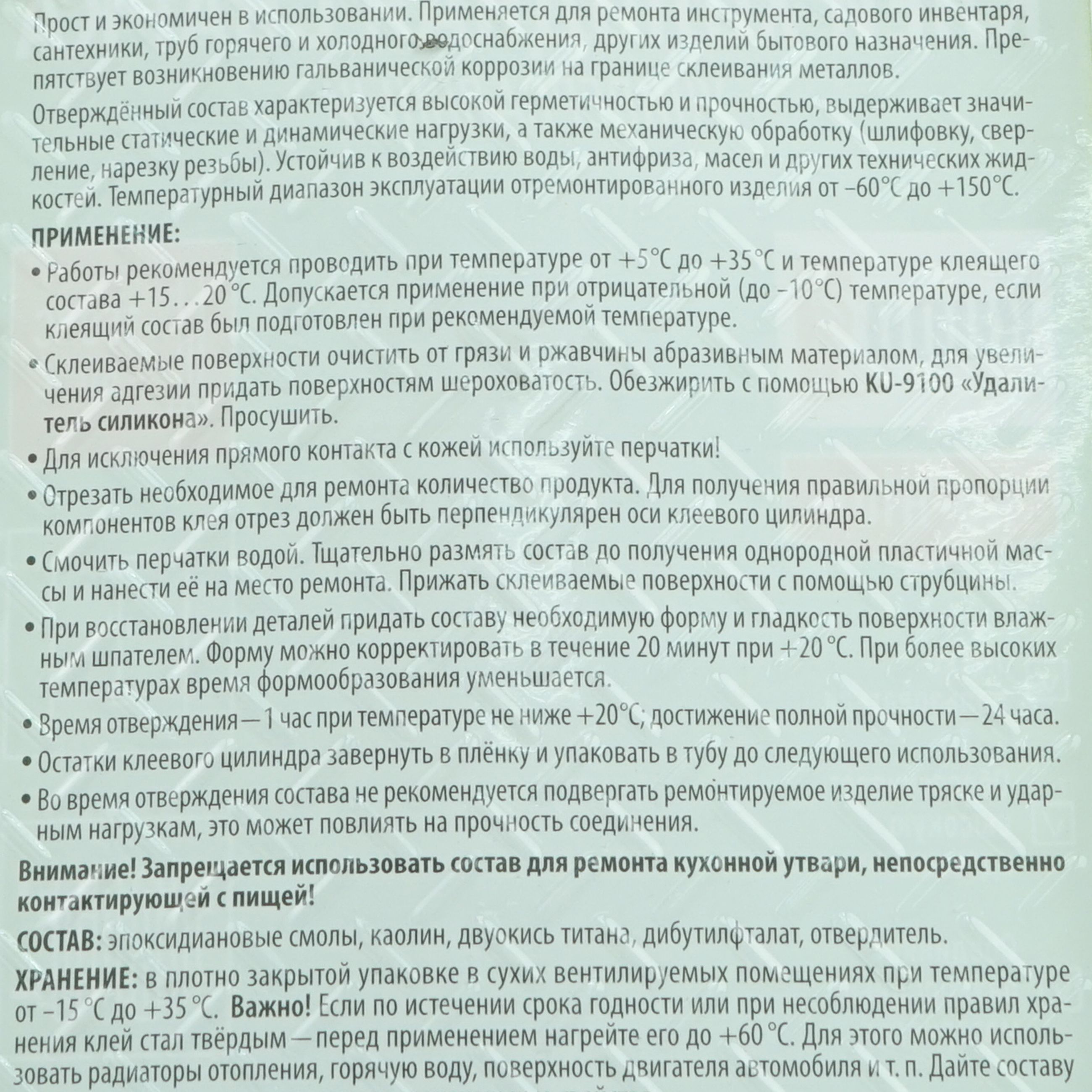 Применяется для ремонта инструмента, садового инвентаря, сантехники, труб горячего и холодного водоснабжения, других изделий бытового назначения. Препятствует возникновению гальванической коррозии на границе склеивания металлов.