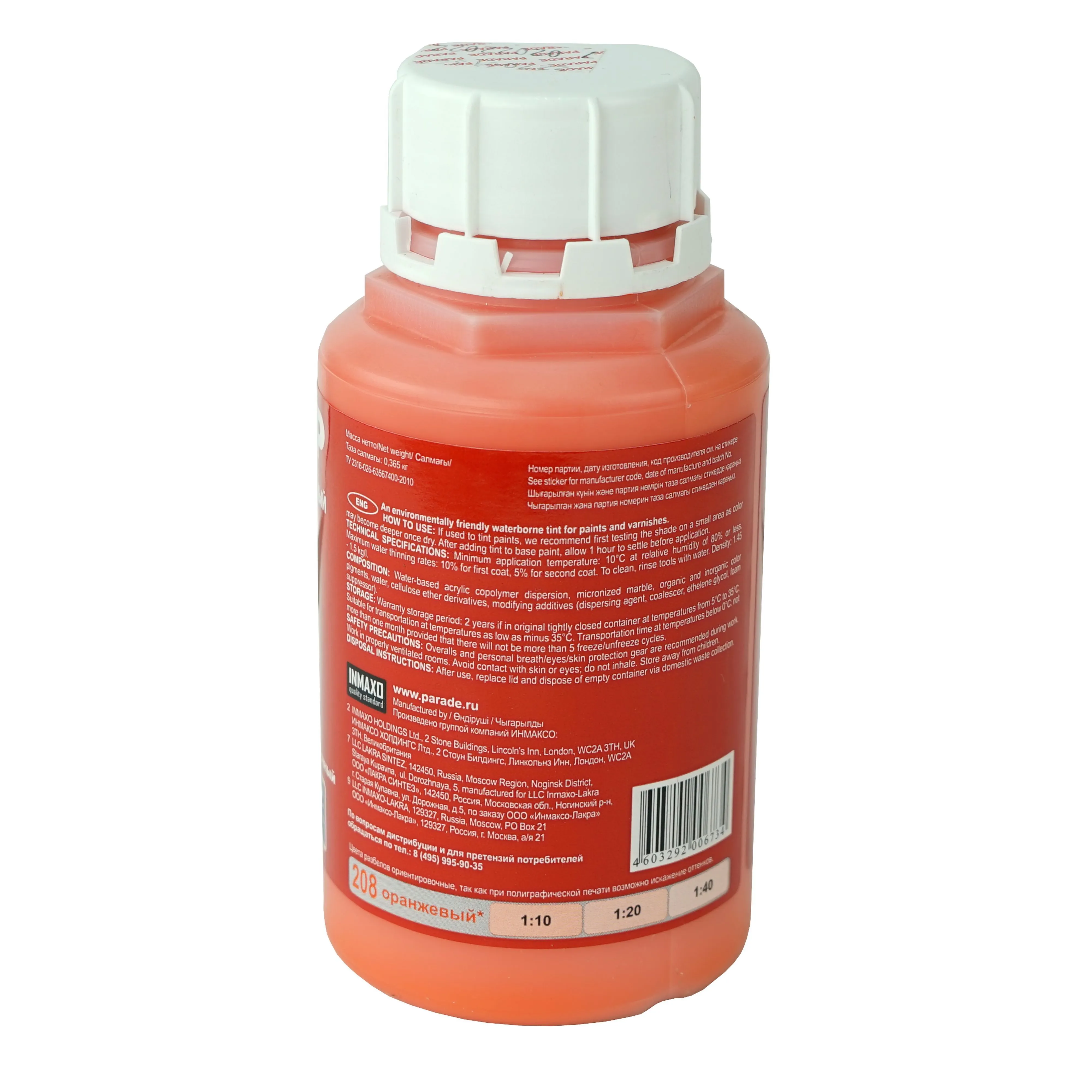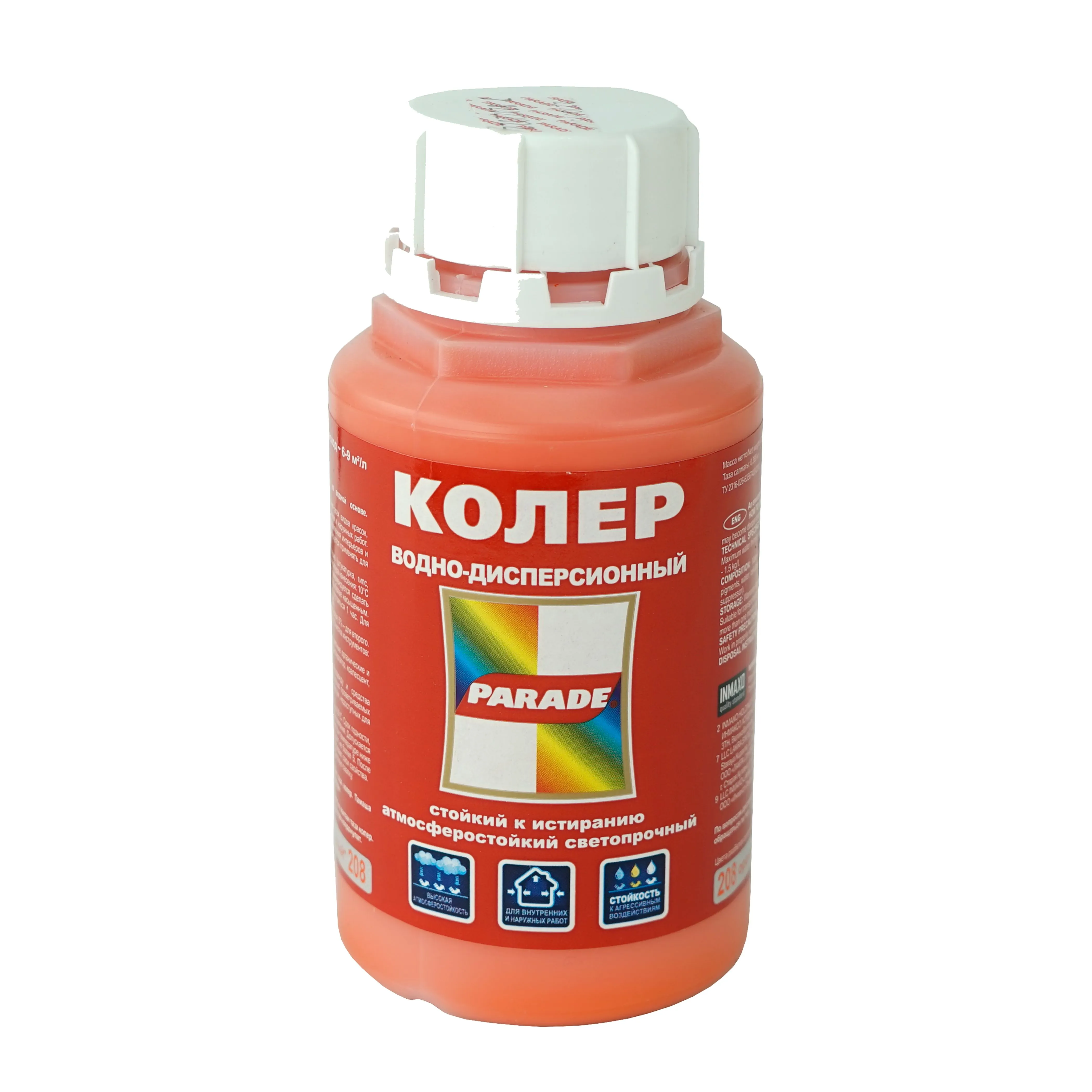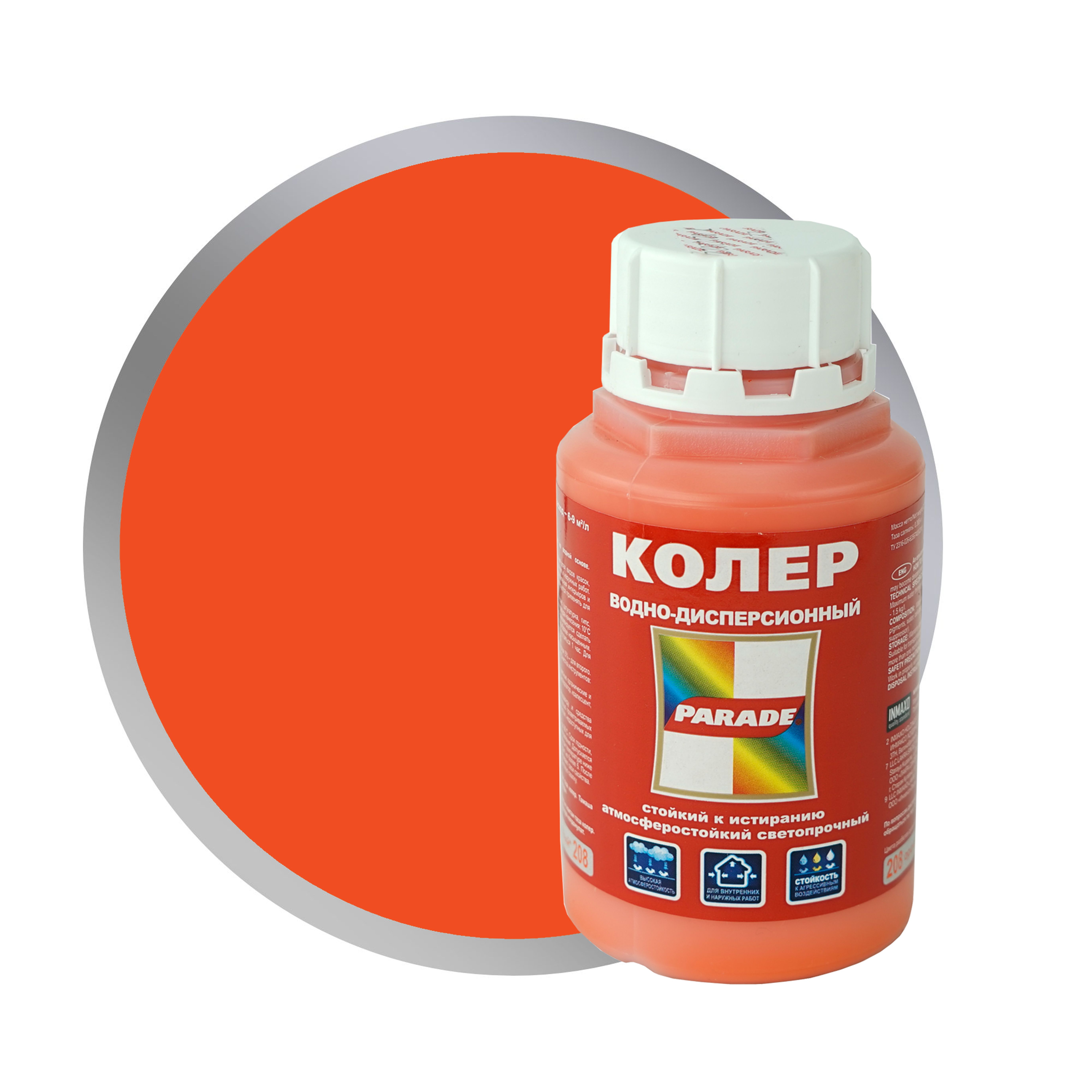 Колер-паста ПАРАД №208 Оранжевый, для воднодисперсионной краски 0,25л. Экологически чистый колер для лакокрасочных материалов на водной основе. Состав: Водная дисперсия акрилового сополимера.