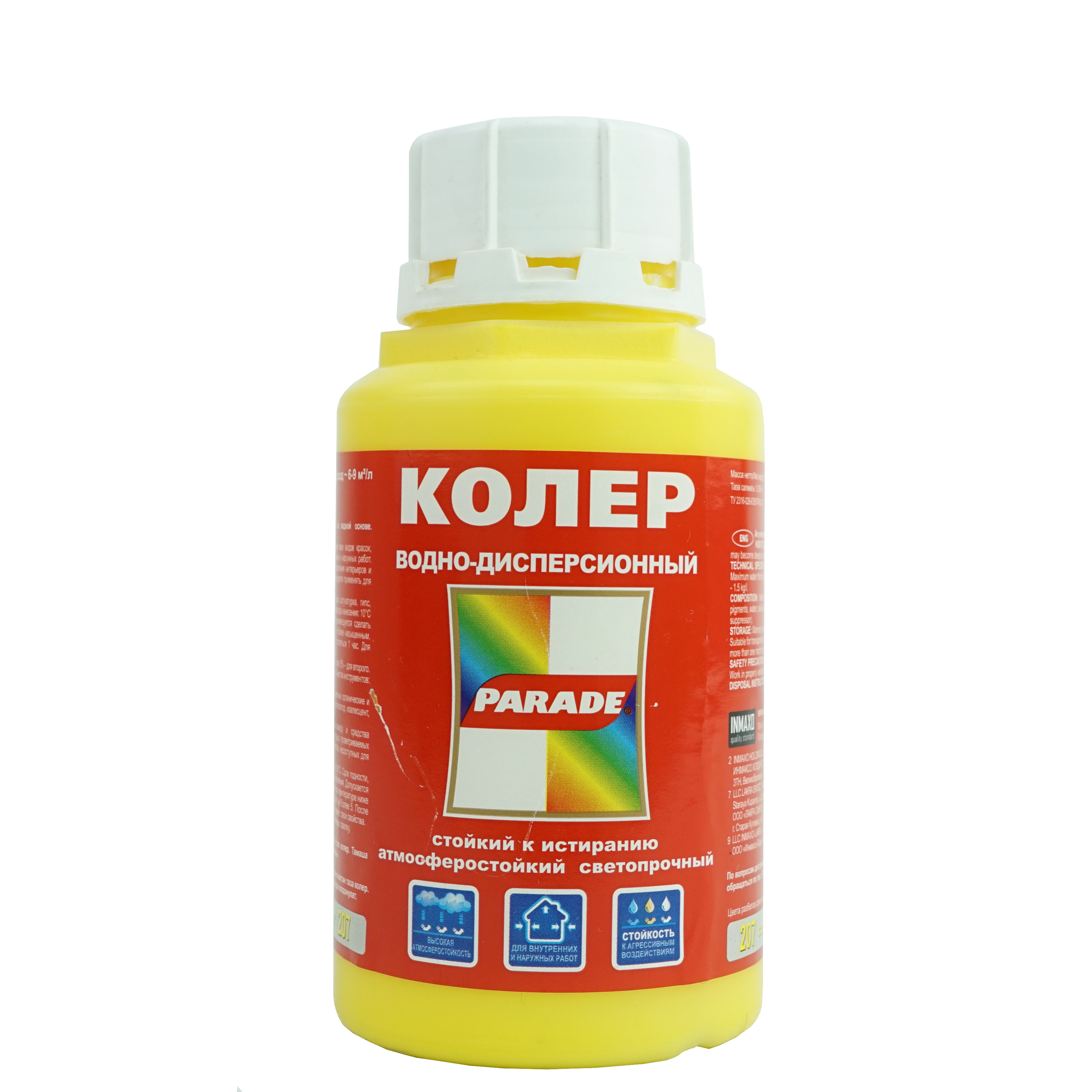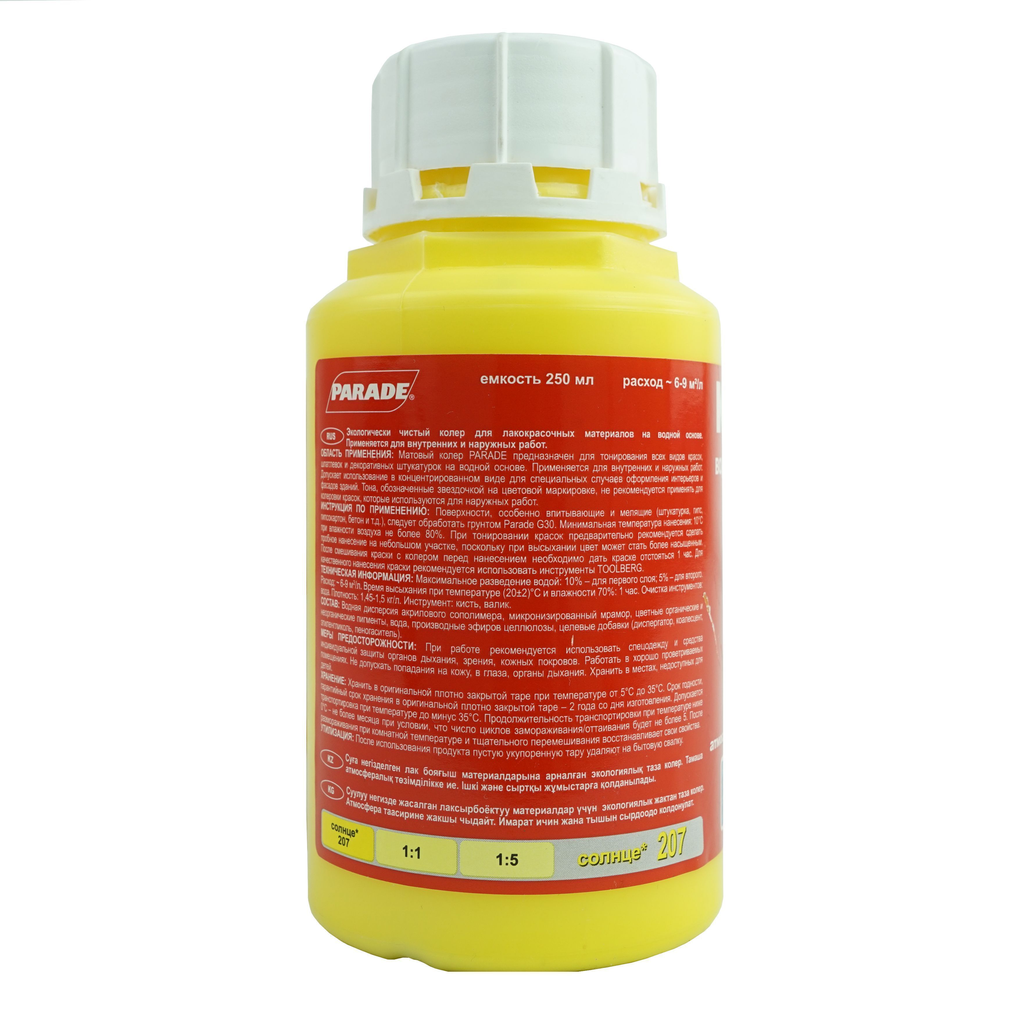 Колер-паста ПАРАД №207 Солнце, для воднодисперсионной краски 0,25л. Экологически чистый колер для лакокрасочных материалов на водной основе. Состав: Водная дисперсия акрилового сополимера.