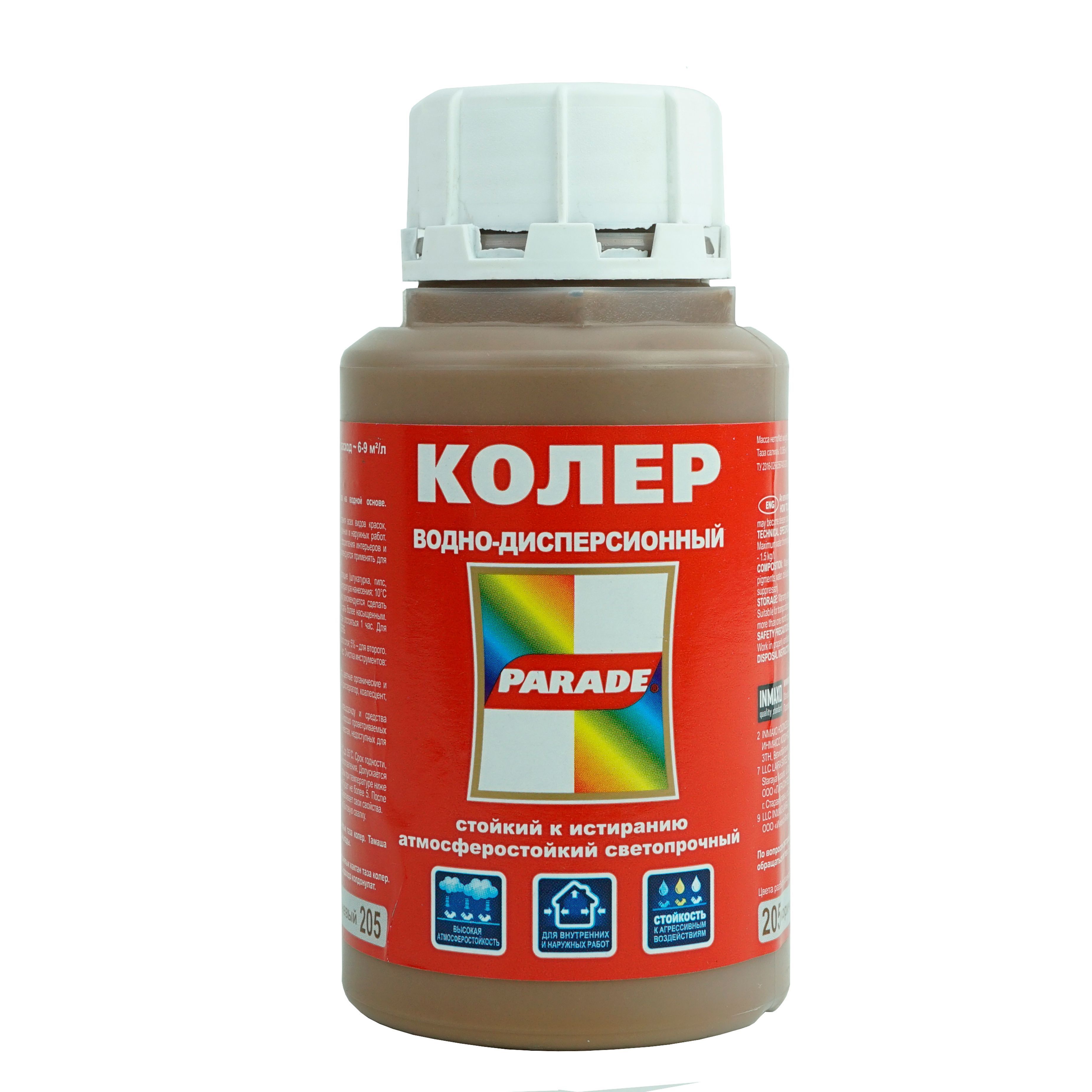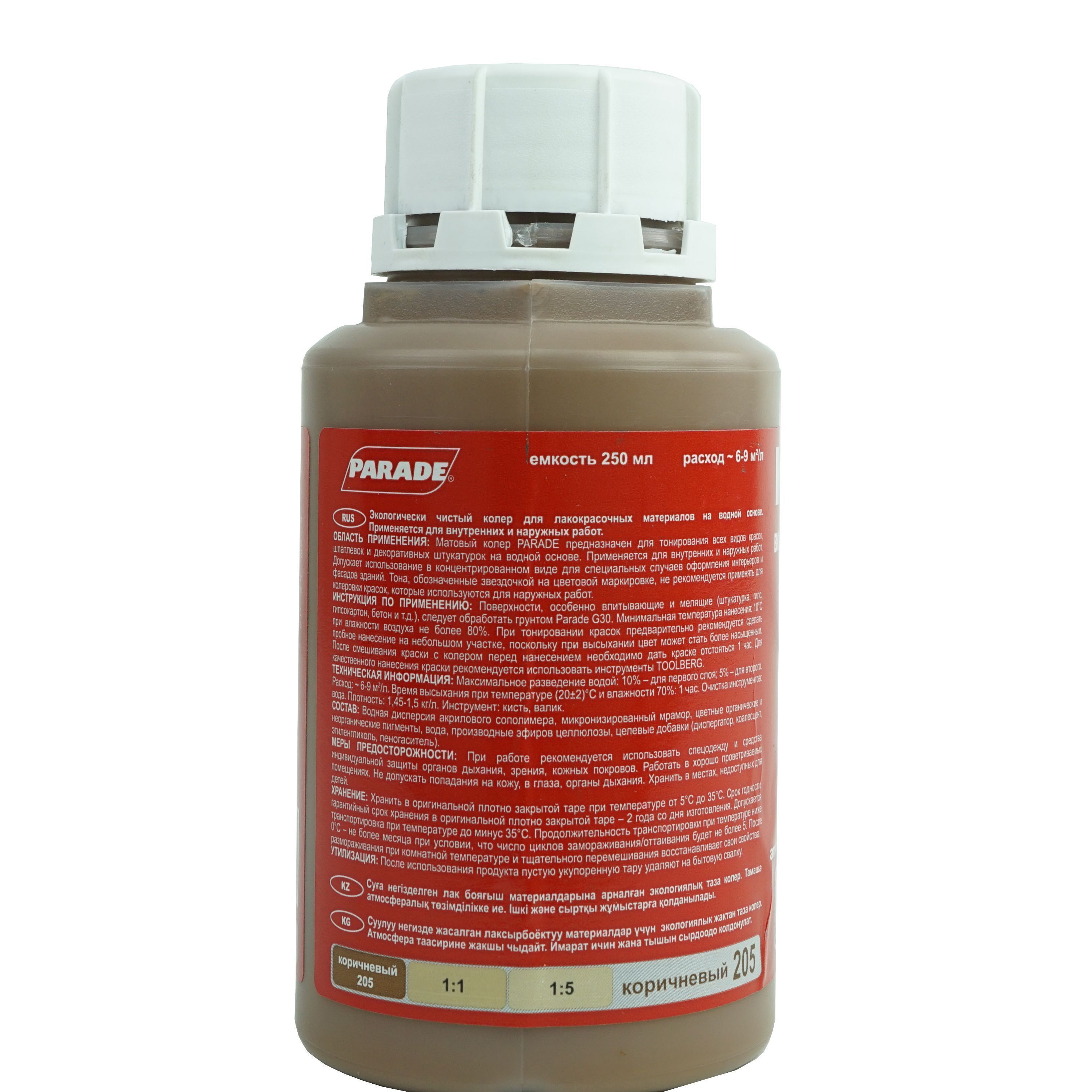 Колер-паста ПАРАД №205 Коричневый, для воднодисперсионной краски 0,25л. Экологически чистый колер для лакокрасочных материалов на водной основе. Состав: Водная дисперсия акрилового сополимера.