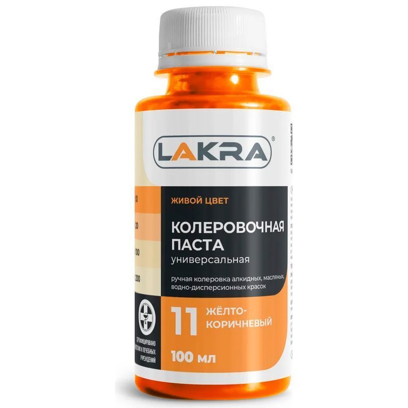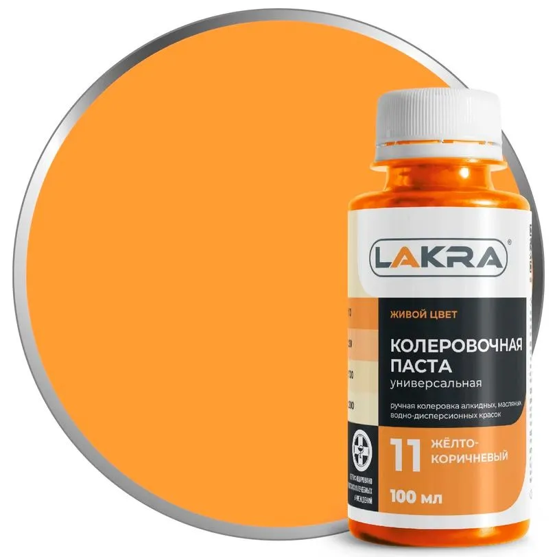 Колер-паста Лакра 11 желто-коричневый, универсальная. Состав: Пигменты, наполнитель, этиленгликоль, технологические добавки (противоседиментационные, диспергатор, пеногаситель).