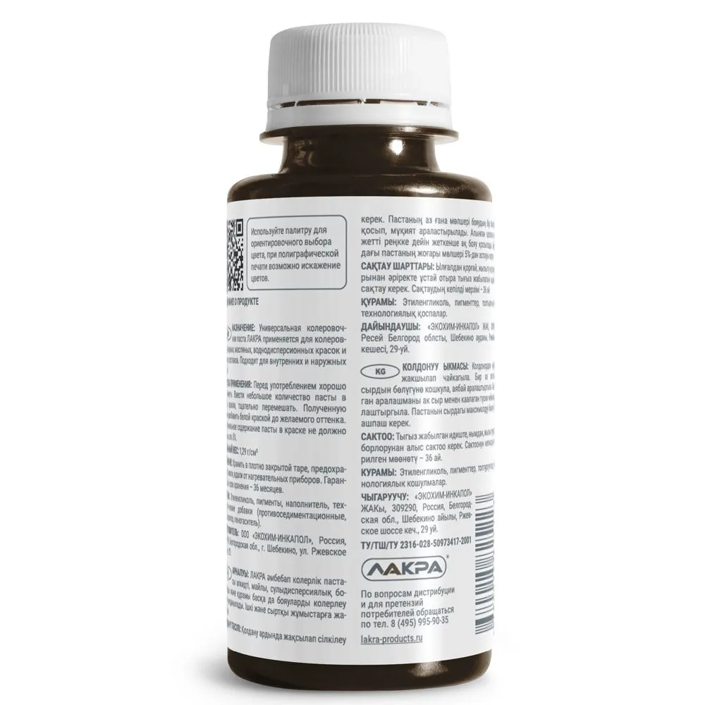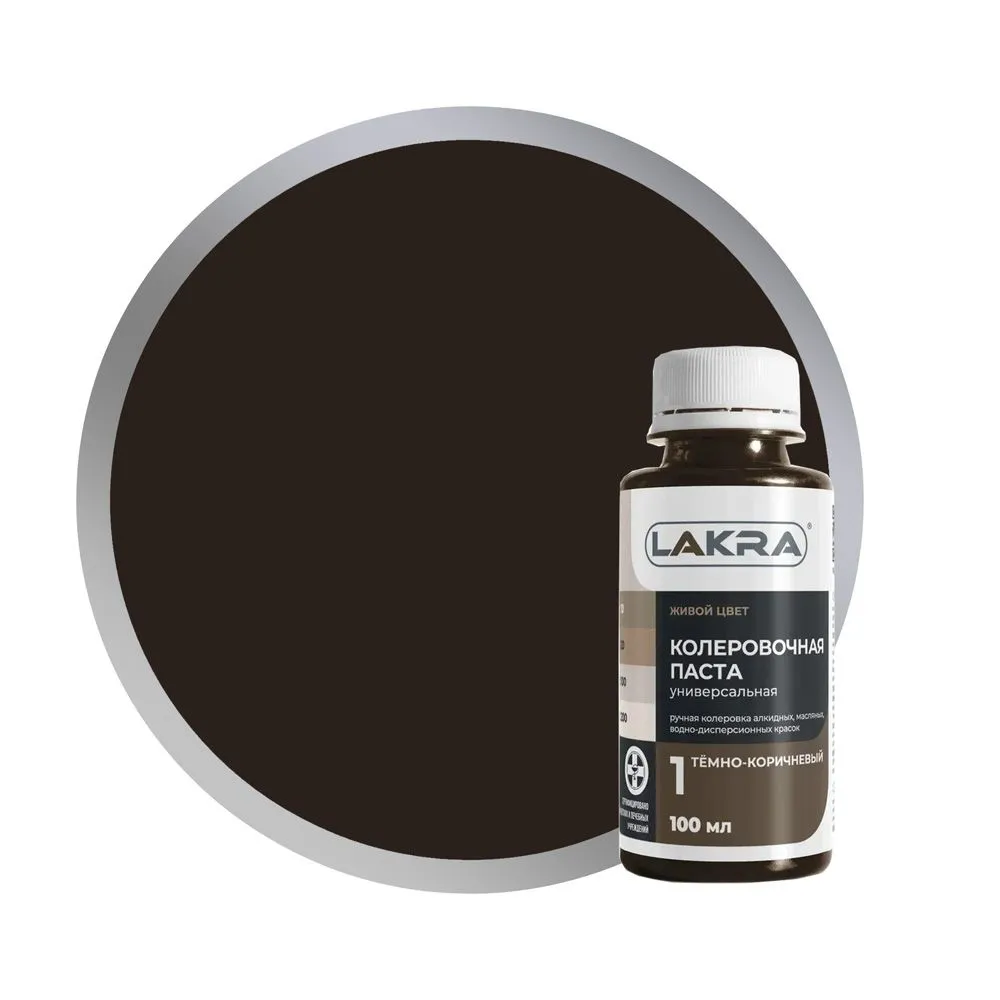Колер-паста Лакра 01 темно-коричневый, универсальная. Состав: Пигменты, наполнитель, этиленгликоль, технологические добавки (противоседиментационные, диспергатор, пеногаситель).