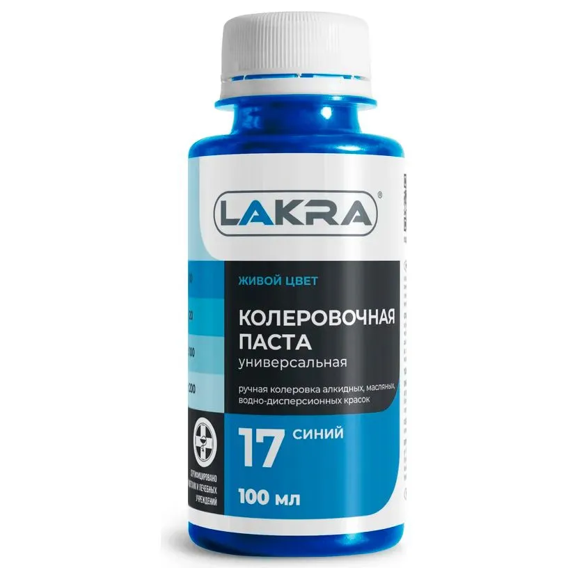 Колер-паста Лакра 17 синий, универсальная. Состав: Пигменты, наполнитель, этиленгликоль, технологические добавки (противоседиментационные, диспергатор, пеногаситель).