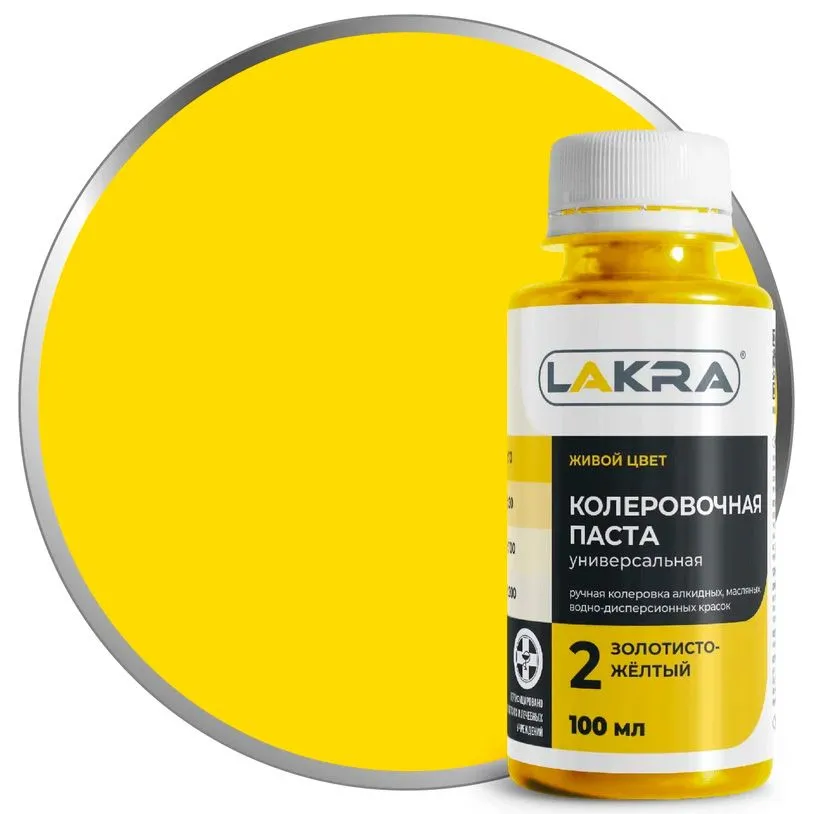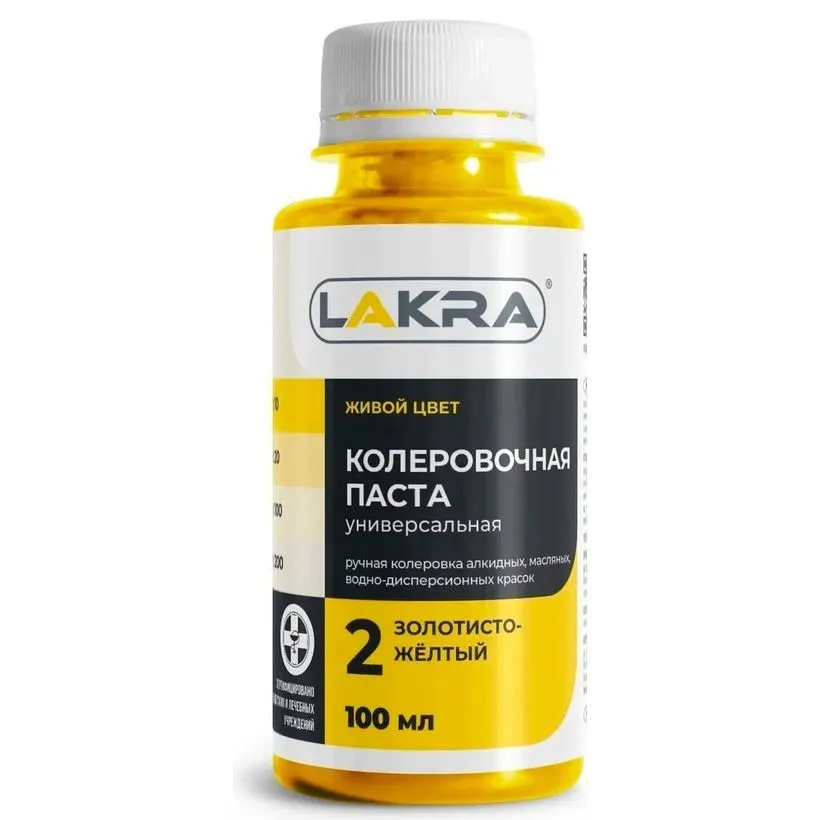 Колер-паста Лакра 02 золотисто-желтый, универсальная. Состав: Пигменты, наполнитель, этиленгликоль, технологические добавки (противоседиментационные, диспергатор, пеногаситель).