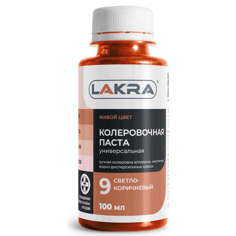 Колер-паста Лакра 09 светло-коричневый, универсальная. Состав: Пигменты, наполнитель, этиленгликоль, технологические добавки (противоседиментационные, диспергатор, пеногаситель).