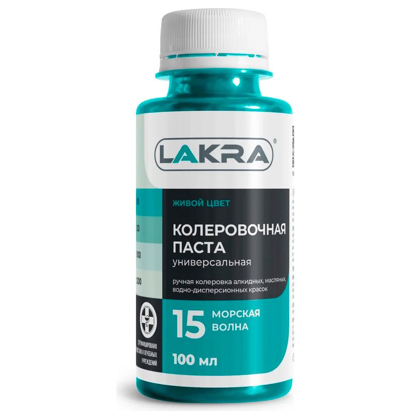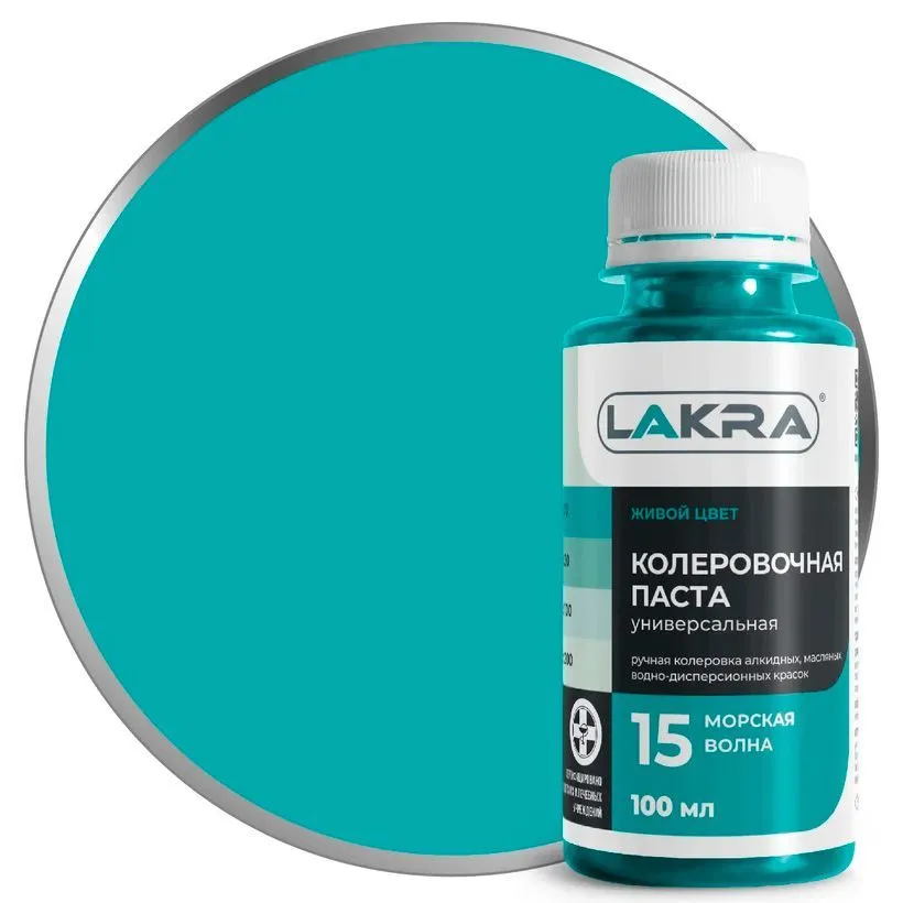 Колер-паста Лакра 15 морская волна, универсальная. Состав: Пигменты, наполнитель, этиленгликоль, технологические добавки (противоседиментационные, диспергатор, пеногаситель).